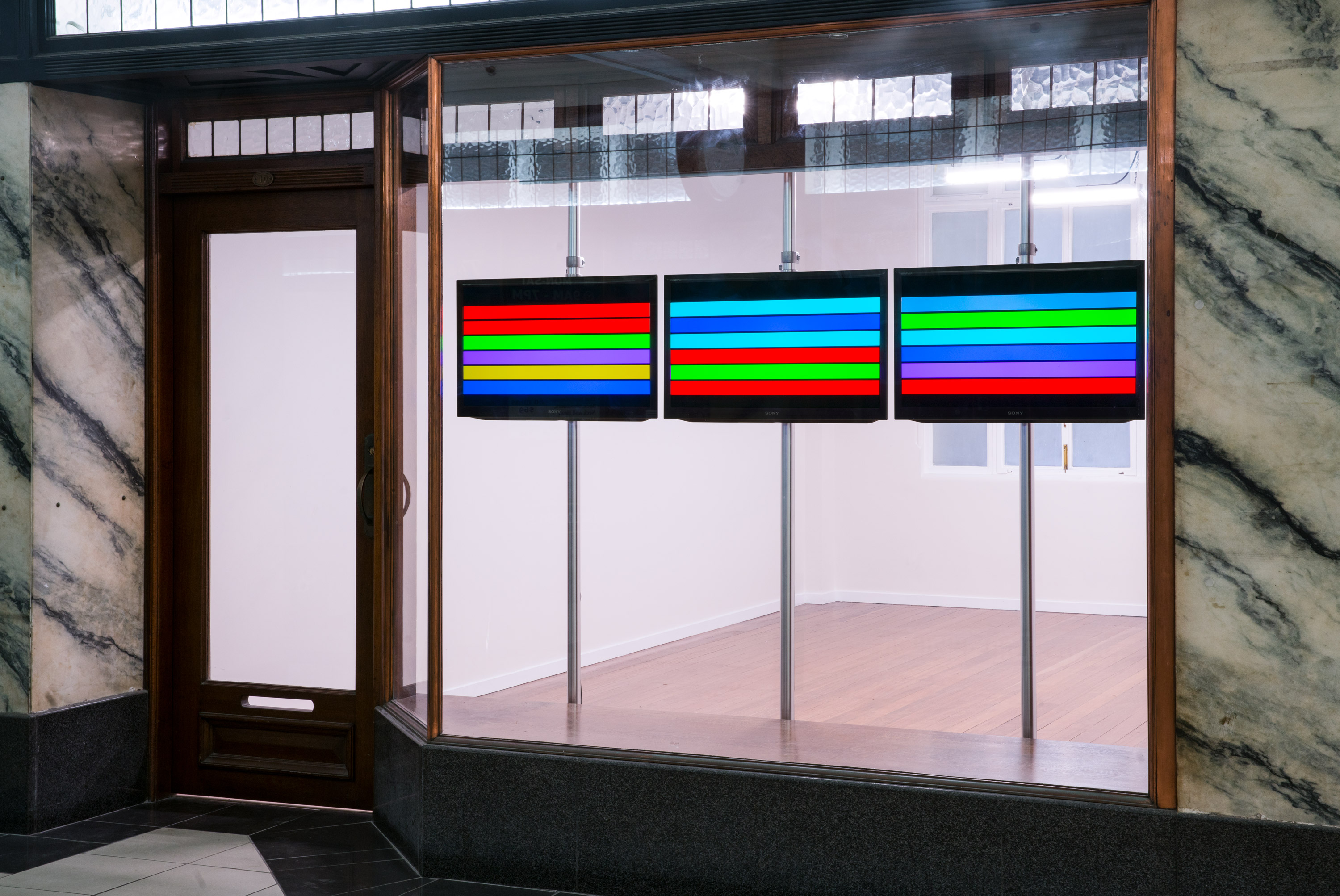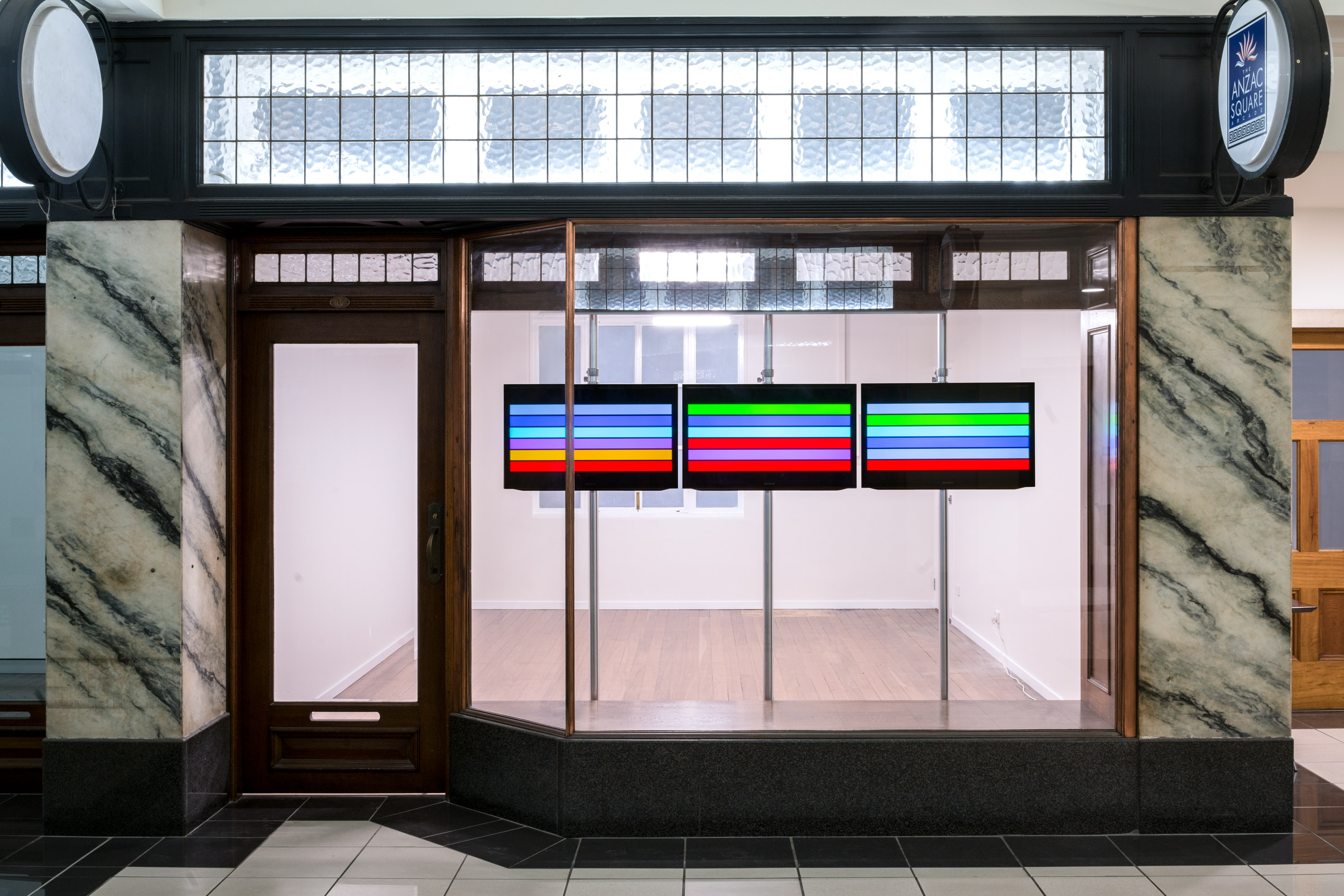 Default Collective’s new video installation responds to the specific location of the shopfront: situated in an arcade that acts as a thoroughfare to Brisbane’s Central train station. The work isolates the formal aesthetic of the modes of data transmission that guide commuters. Without content, they become abstract fields of colour, slowly flickering and changing across the screens. The ubiquitous, yet largely transparent, mediums that transmit this information are made visible and, simultaneously, are rendered without purpose.