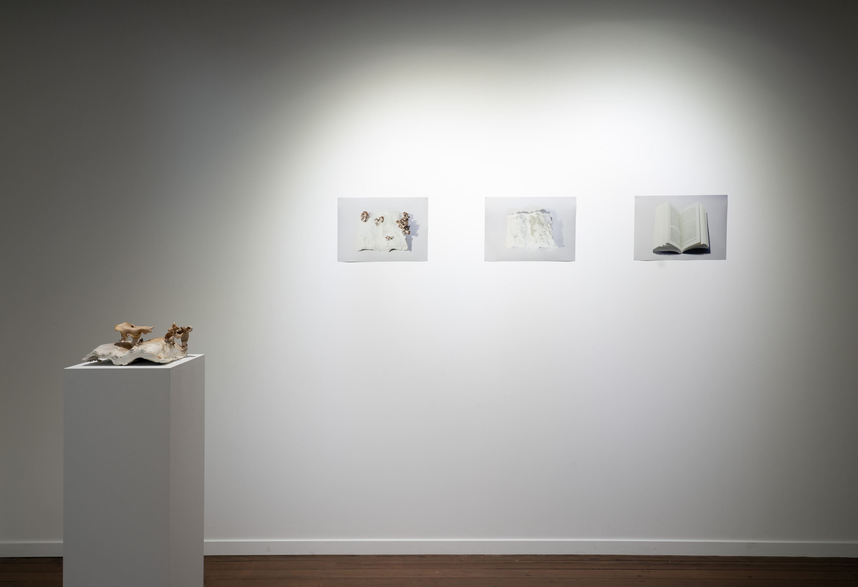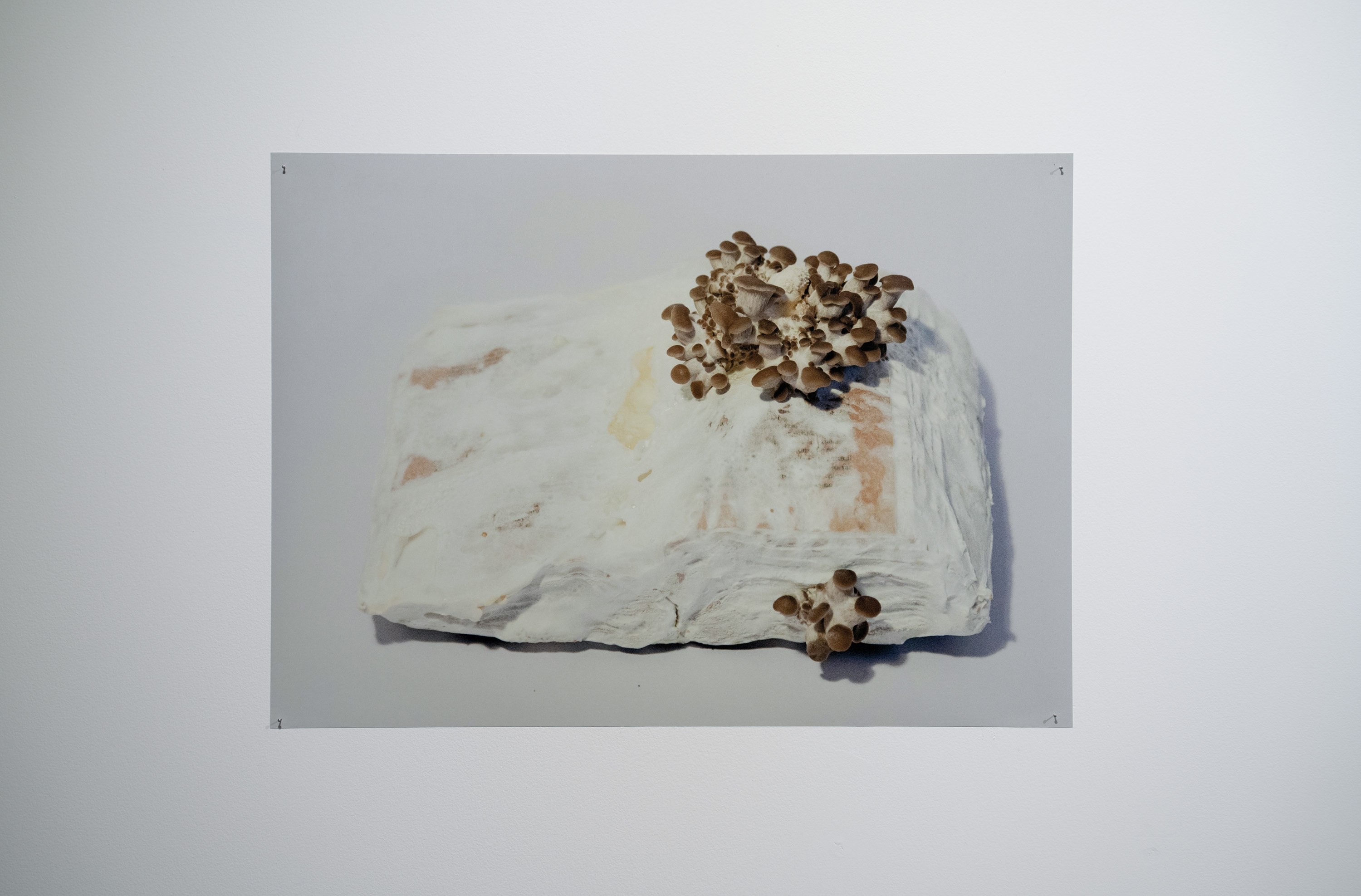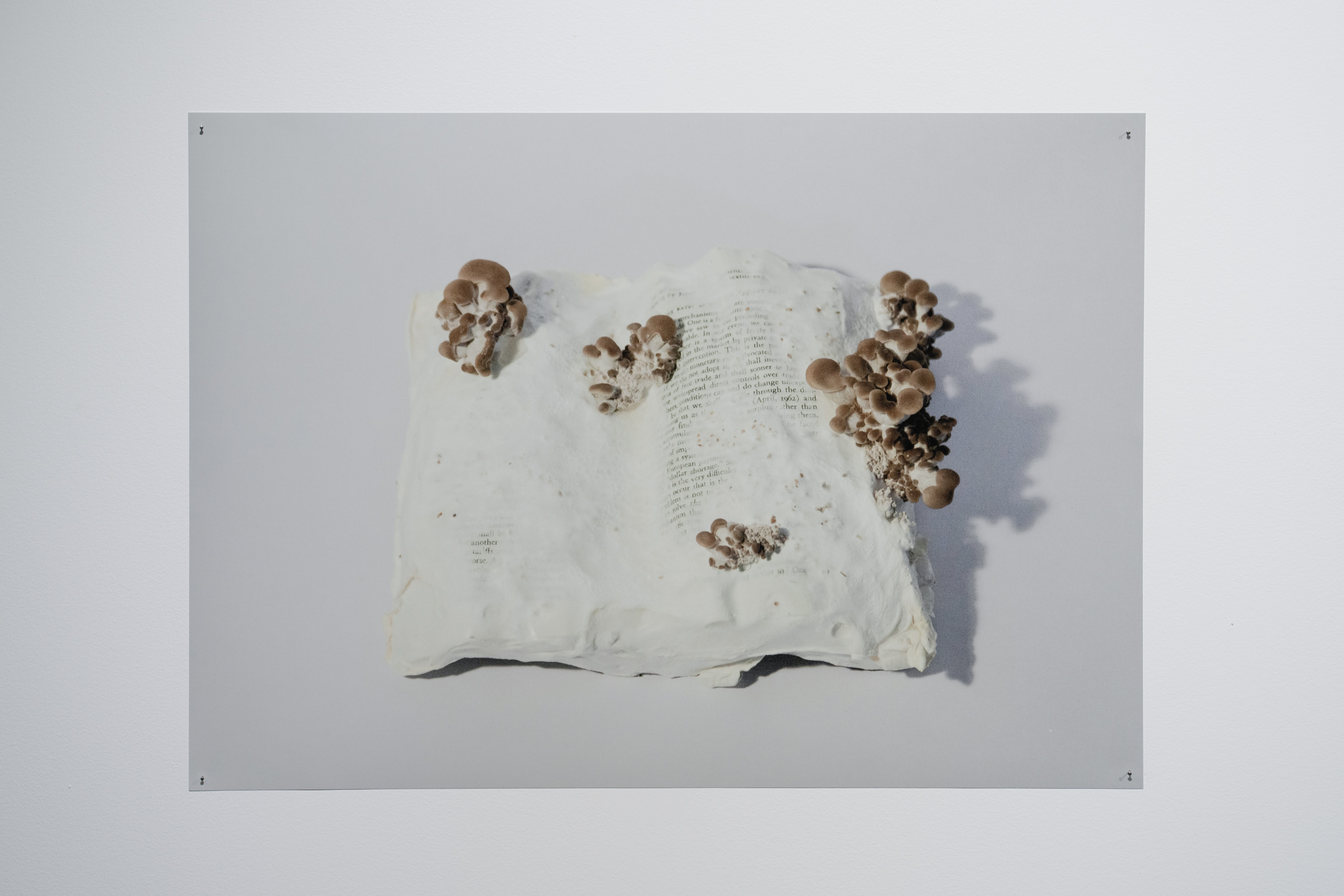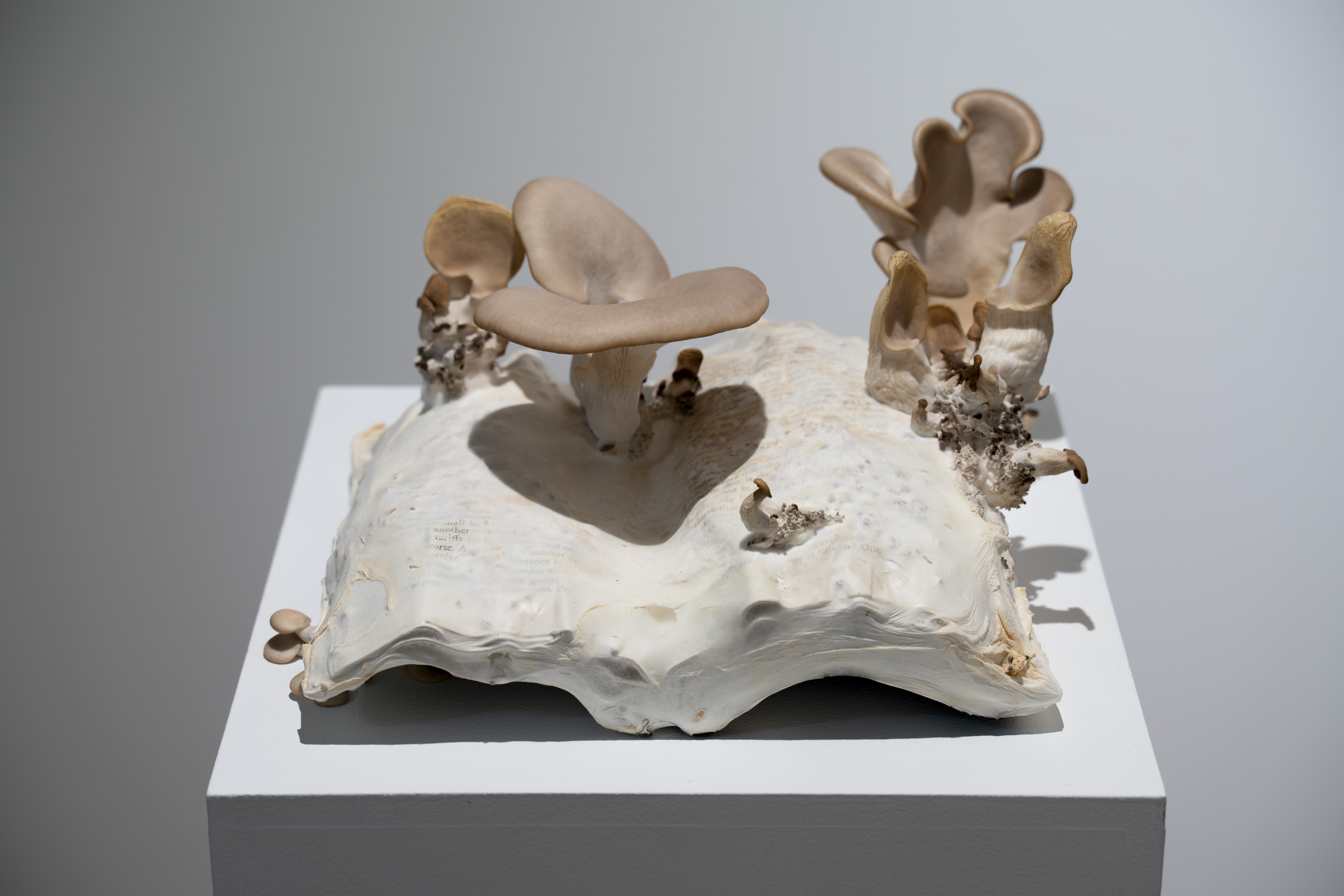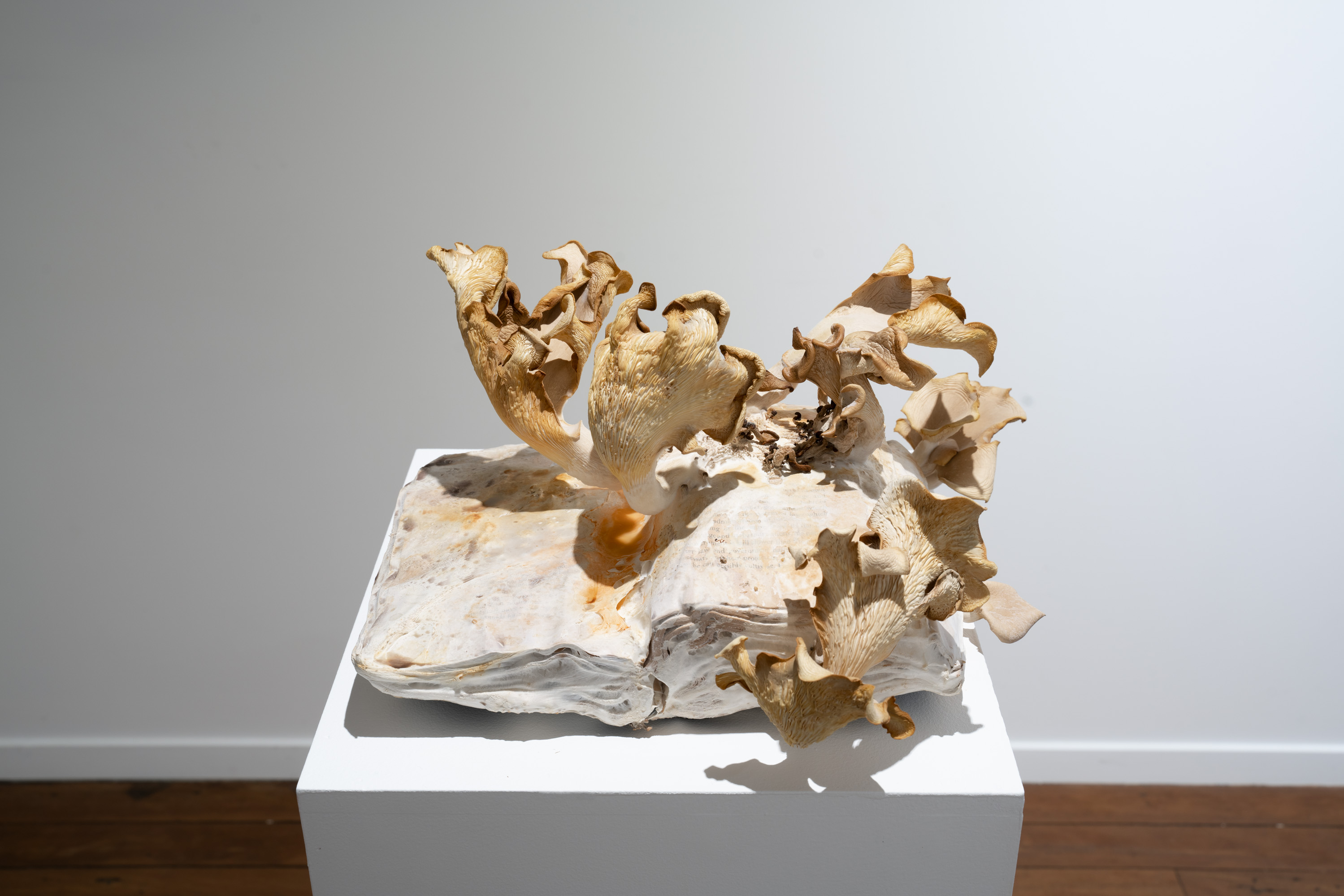 In Metabolis(h)ing, native oyster mushrooms decompose and metabolise three seminal capitalist texts. Plumes of interconnecting mycelial threads envelop the books, transmuting their physical and conceptual contents into sustenance for the fungi’s fruiting bodies to grow. These mycelium networks are woven beneath/through all spaces we encounter. Ever-branching, connecting individual beings in rhizomatic webs of reciprocity, transmuting death into regenerative energy, and redistributing surplus wealth throughout interspecies communities. The ephemeral bodies of fungi emerge from decaying matter, reminders of the unseen web of relations that exists beneath/beyond all surface life, connecting us all.