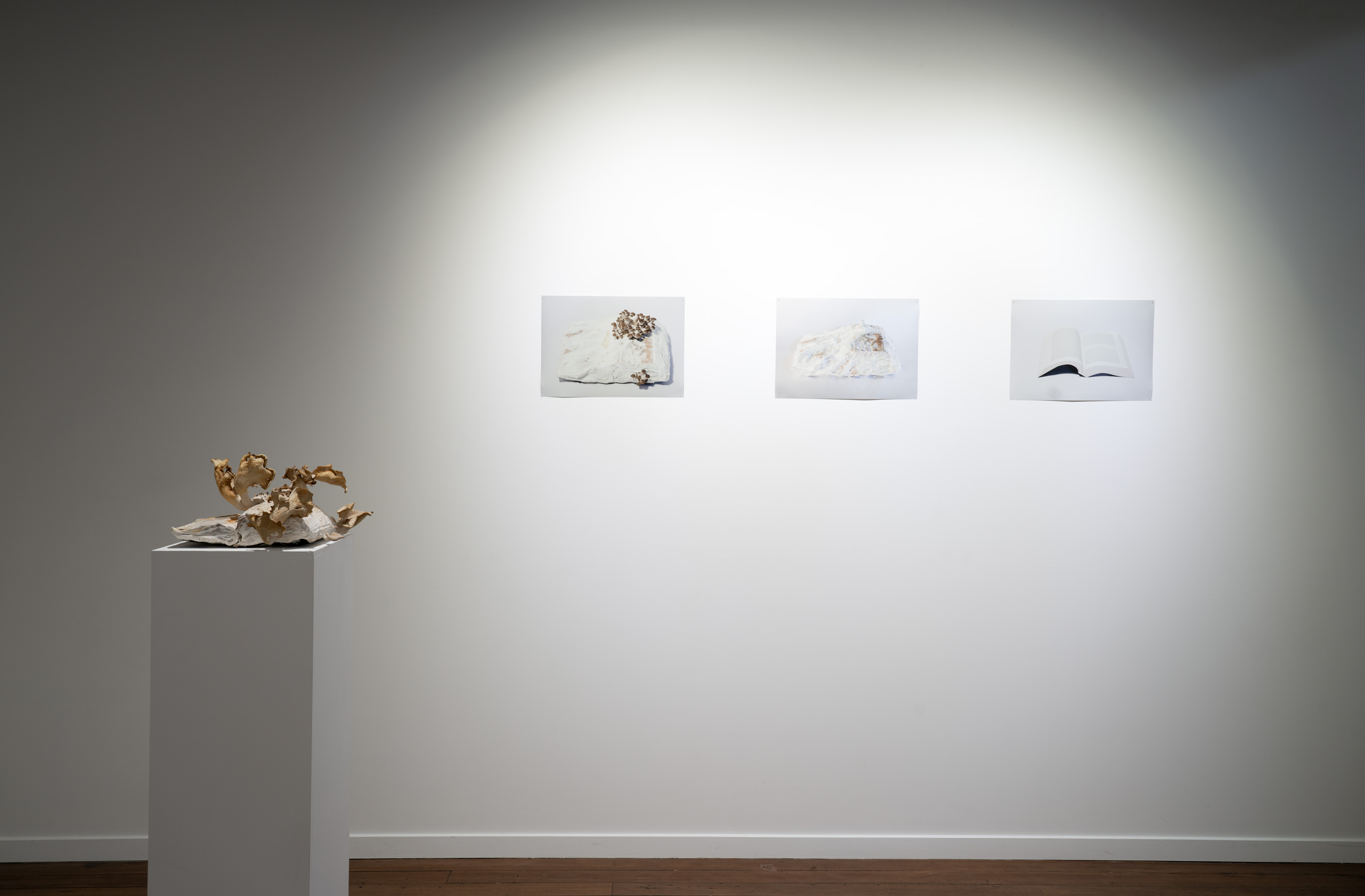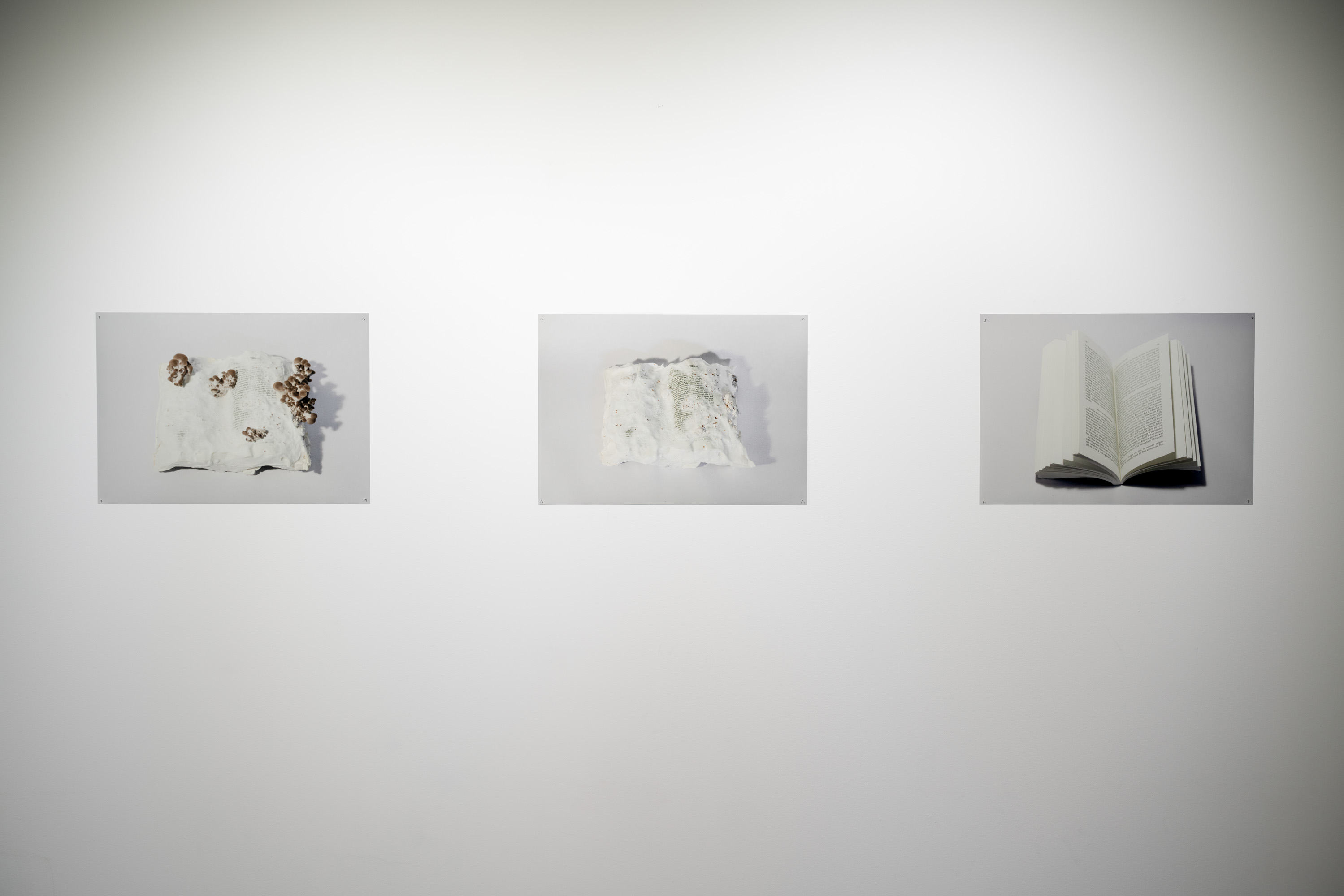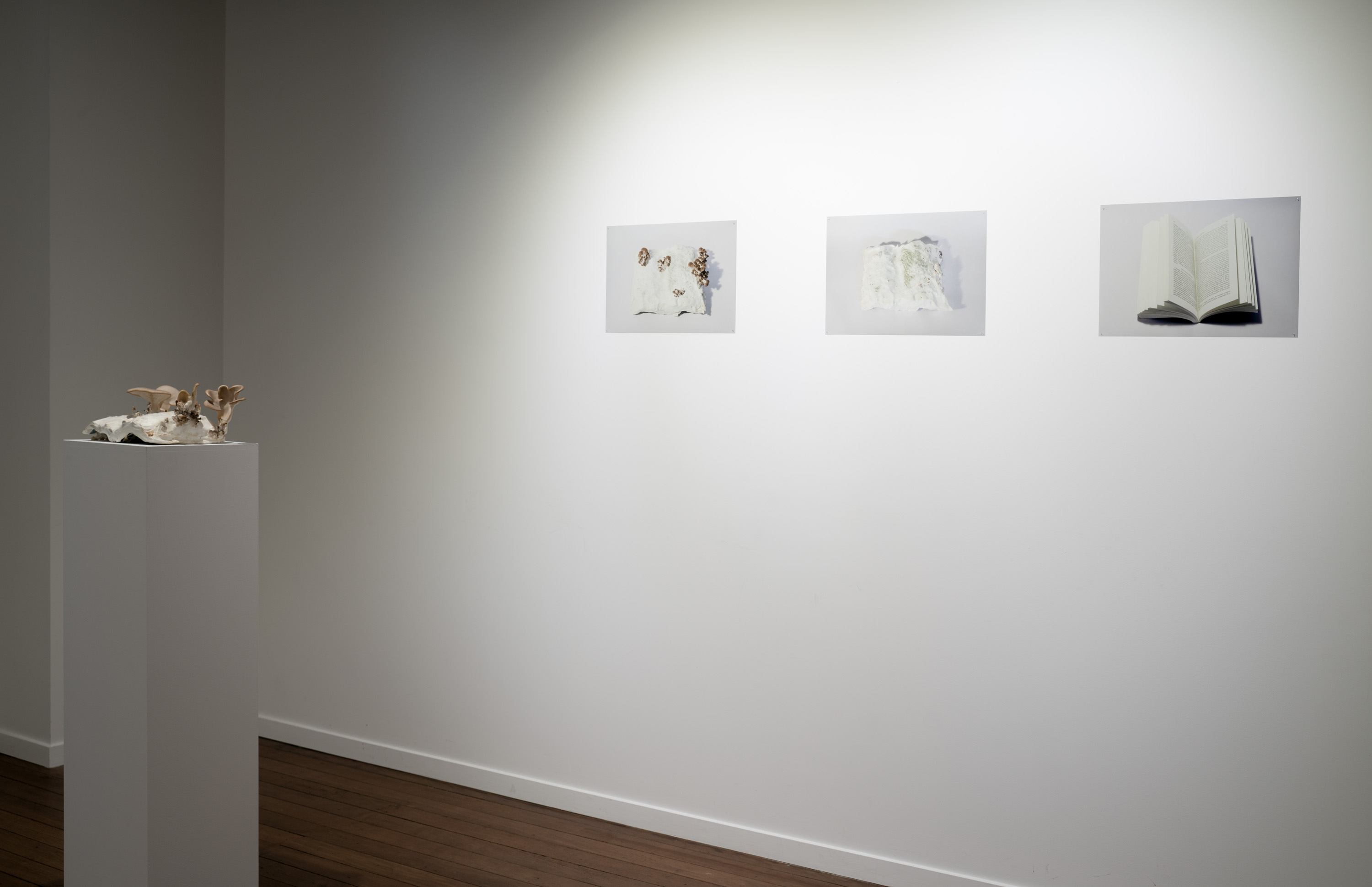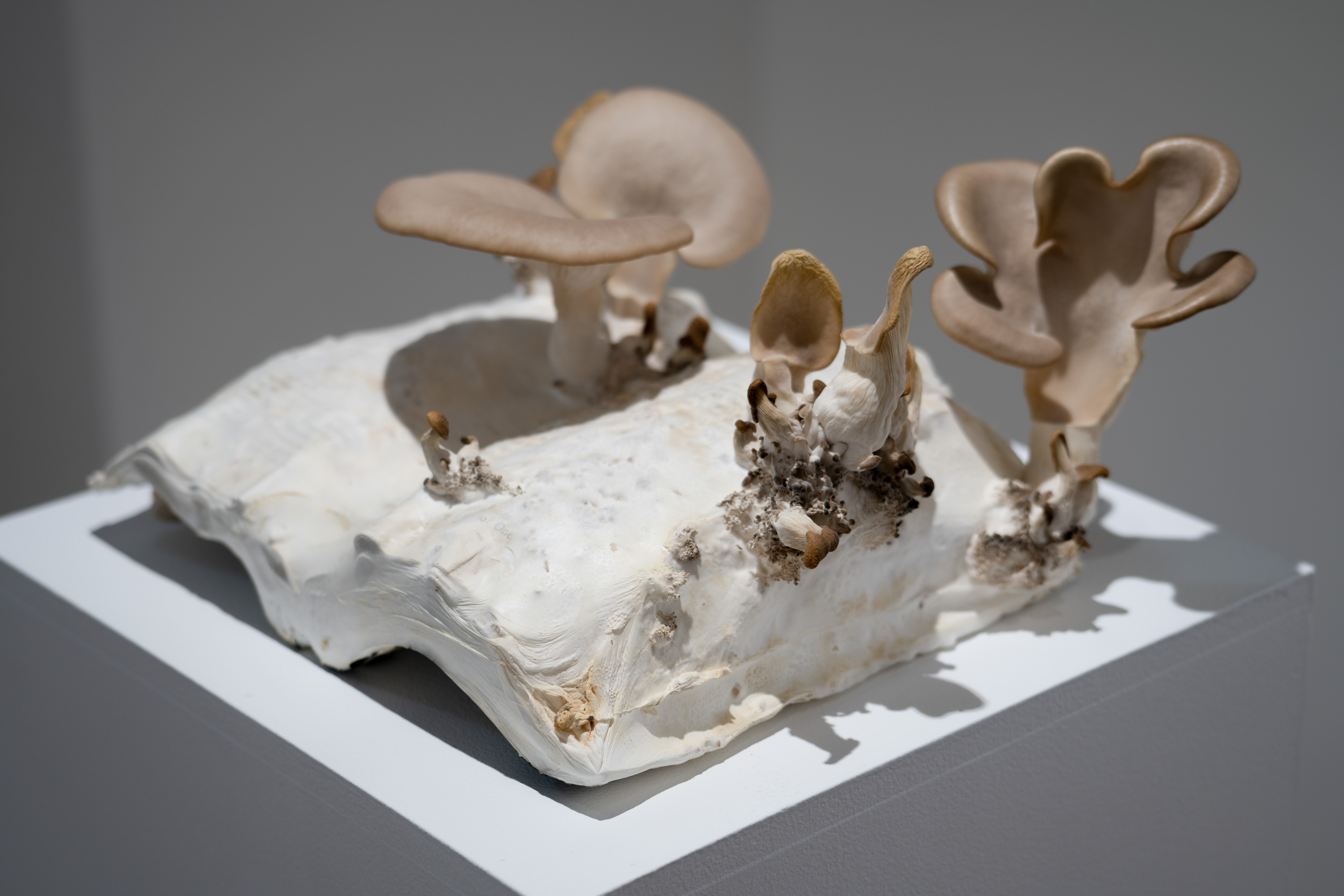 In Metabolis(h)ing, native oyster mushrooms decompose and metabolise three seminal capitalist texts. Plumes of interconnecting mycelial threads envelop the books, transmuting their physical and conceptual contents into sustenance for the fungi’s fruiting bodies to grow. These mycelium networks are woven beneath/through all spaces we encounter. Ever-branching, connecting individual beings in rhizomatic webs of reciprocity, transmuting death into regenerative energy, and redistributing surplus wealth throughout interspecies communities. The ephemeral bodies of fungi emerge from decaying matter, reminders of the unseen web of relations that exists beneath/beyond all surface life, connecting us all.