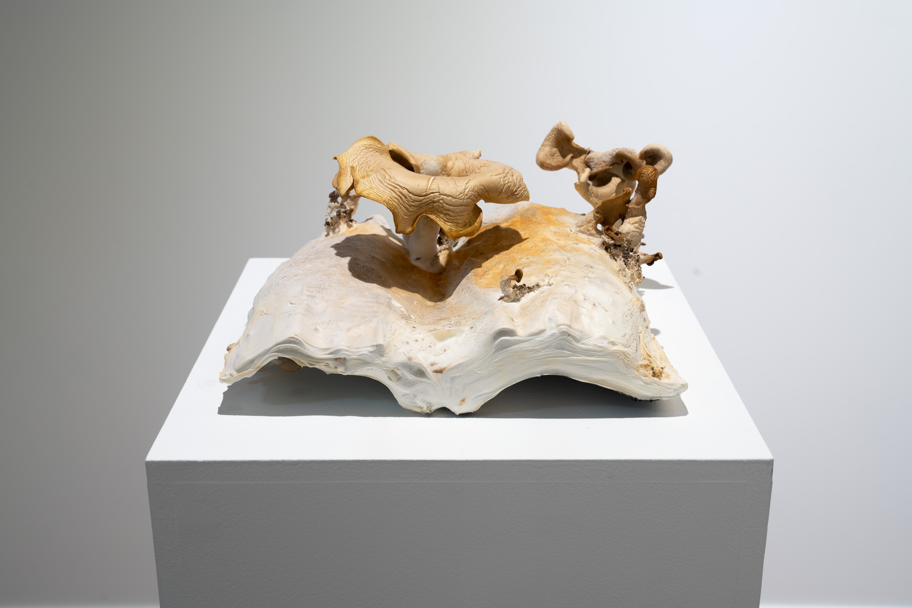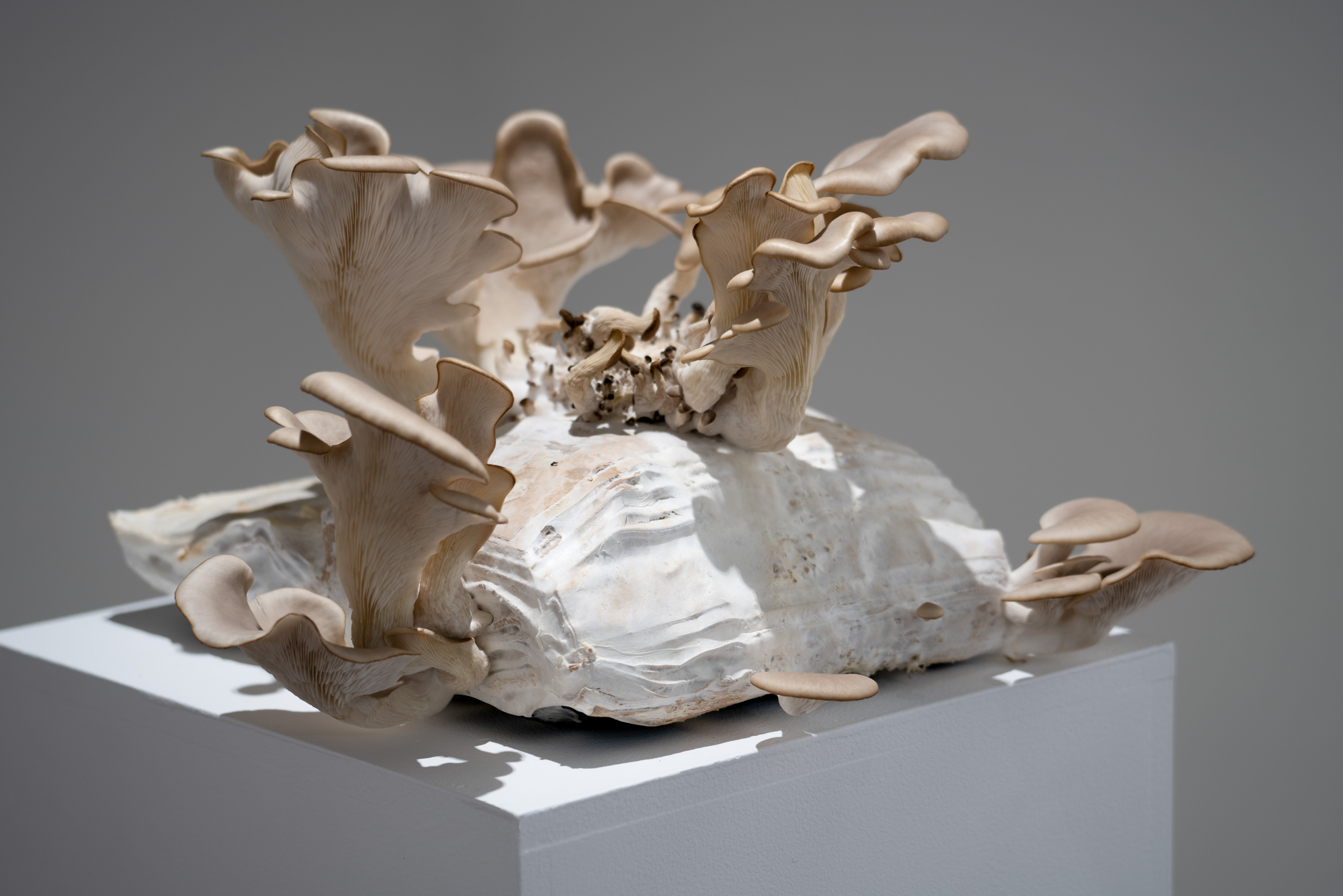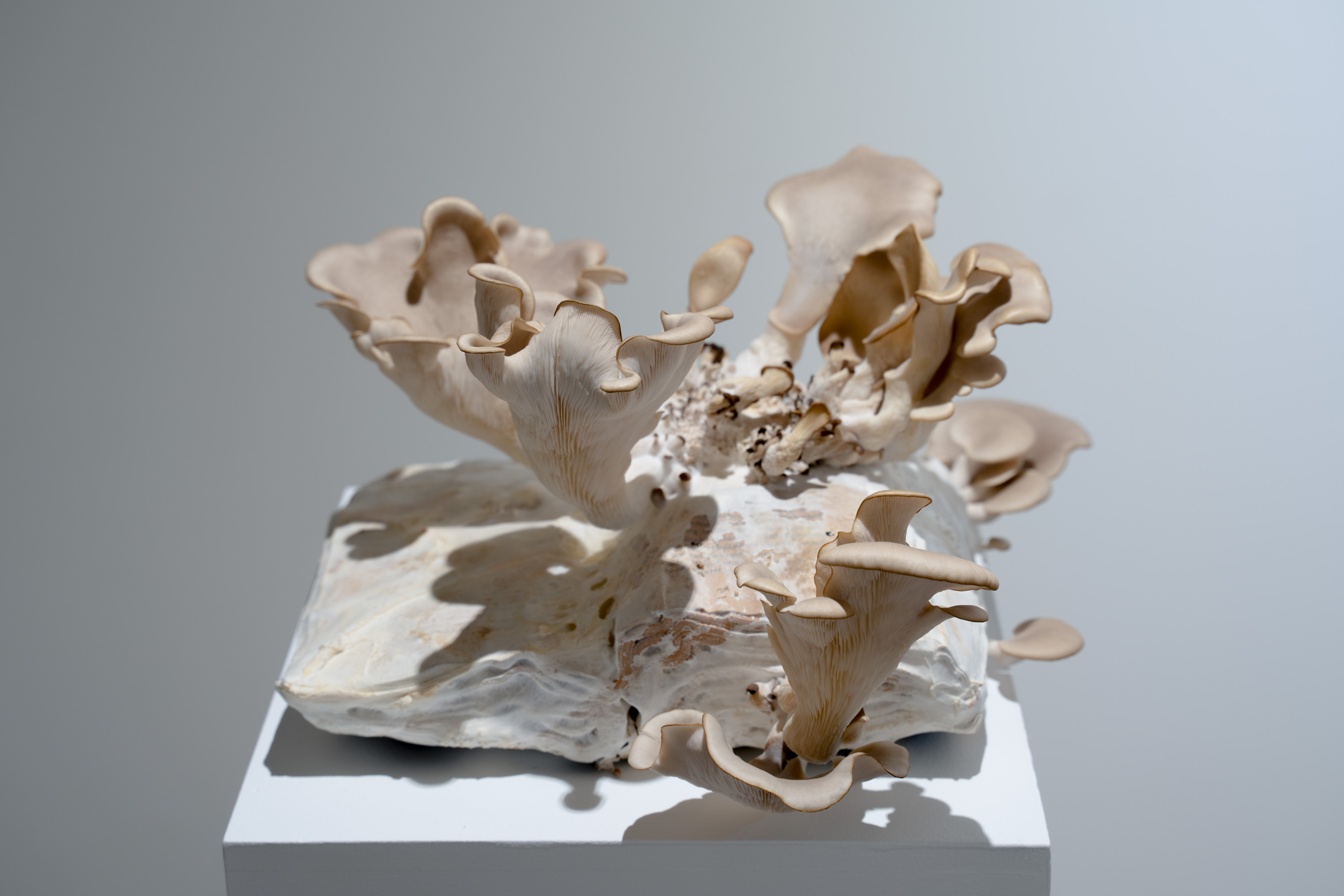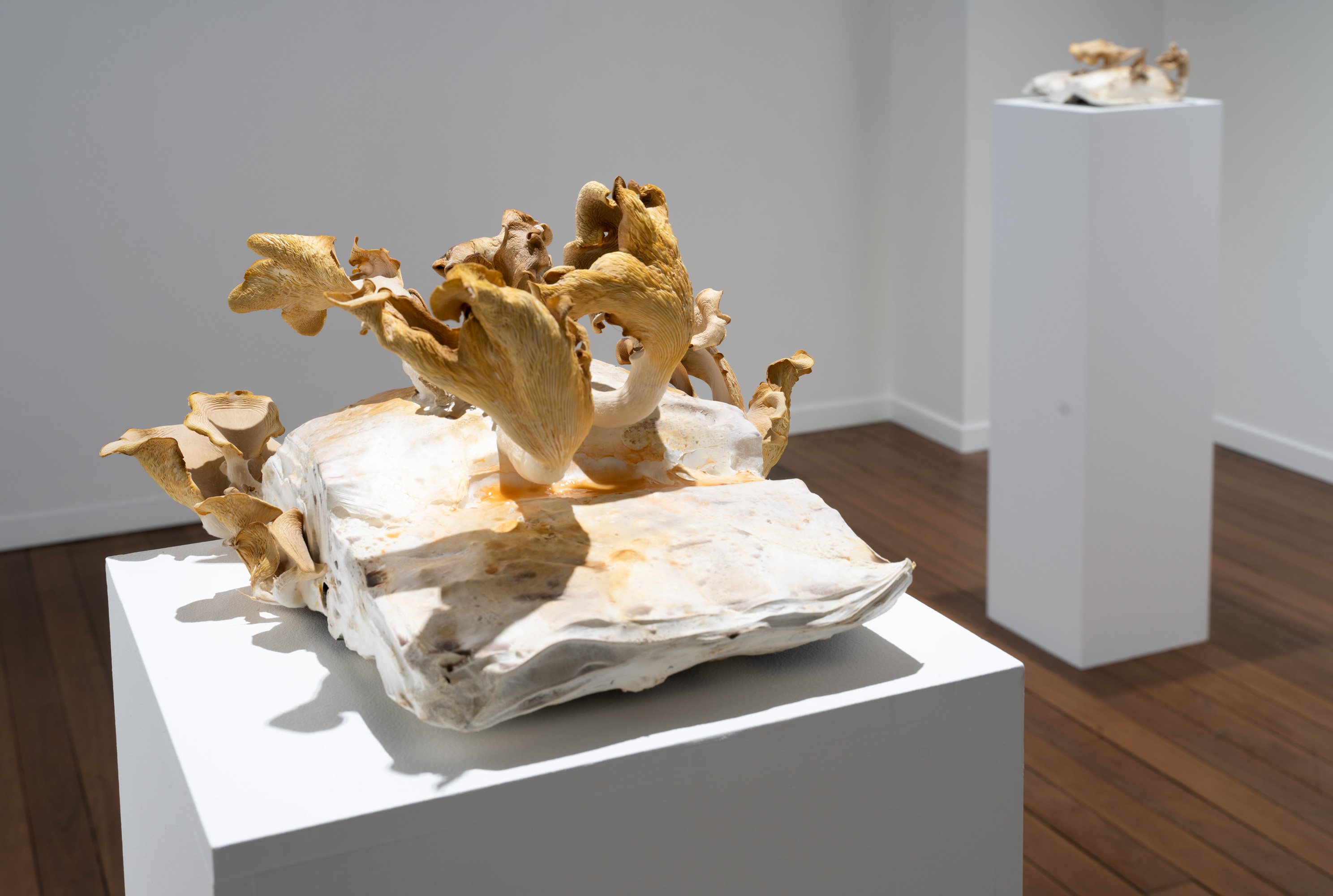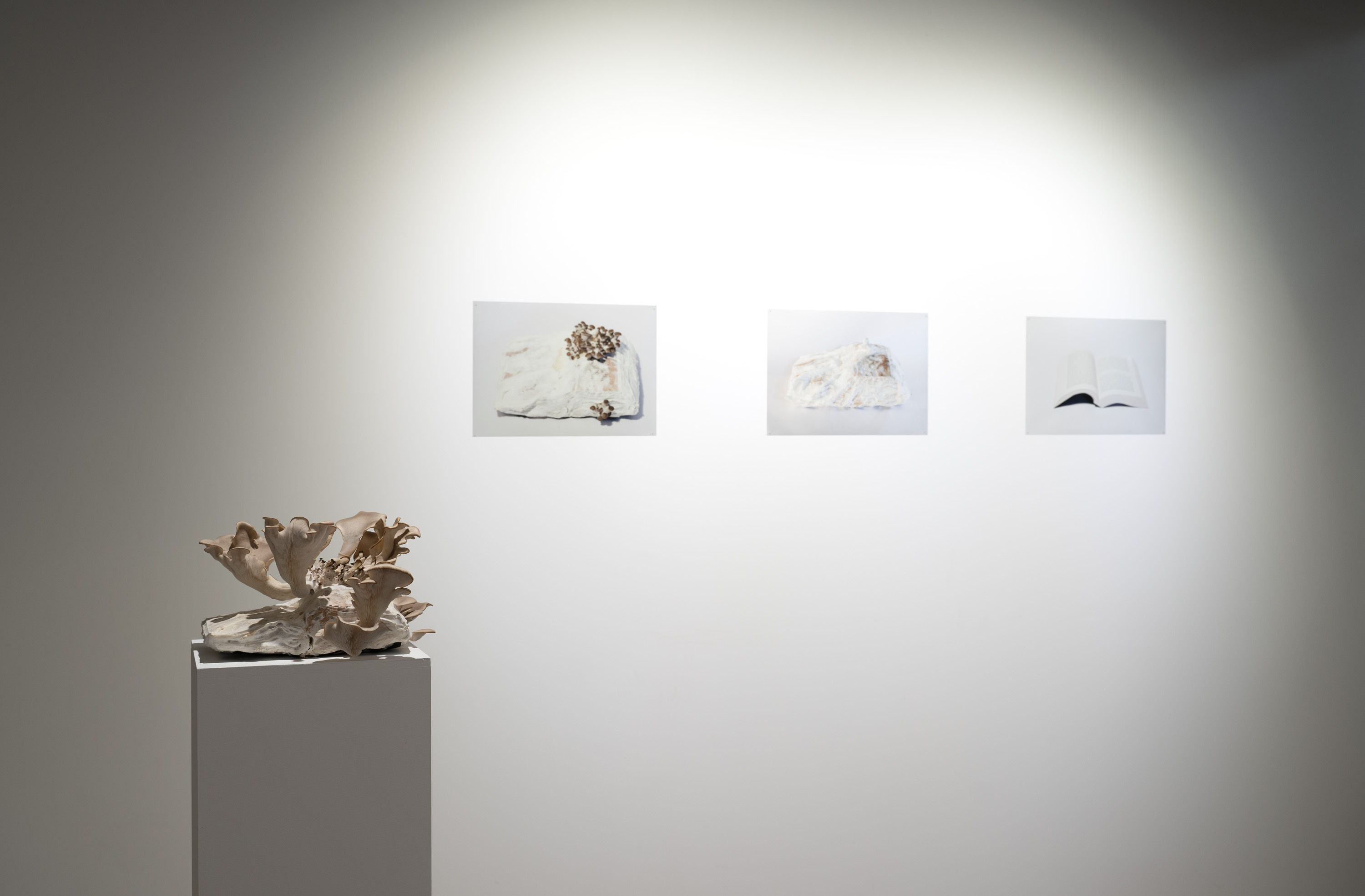 In Metabolis(h)ing, native oyster mushrooms decompose and metabolise three seminal capitalist texts. Plumes of interconnecting mycelial threads envelop the books, transmuting their physical and conceptual contents into sustenance for the fungi’s fruiting bodies to grow. These mycelium networks are woven beneath/through all spaces we encounter. Ever-branching, connecting individual beings in rhizomatic webs of reciprocity, transmuting death into regenerative energy, and redistributing surplus wealth throughout interspecies communities. The ephemeral bodies of fungi emerge from decaying matter, reminders of the unseen web of relations that exists beneath/beyond all surface life, connecting us all.
