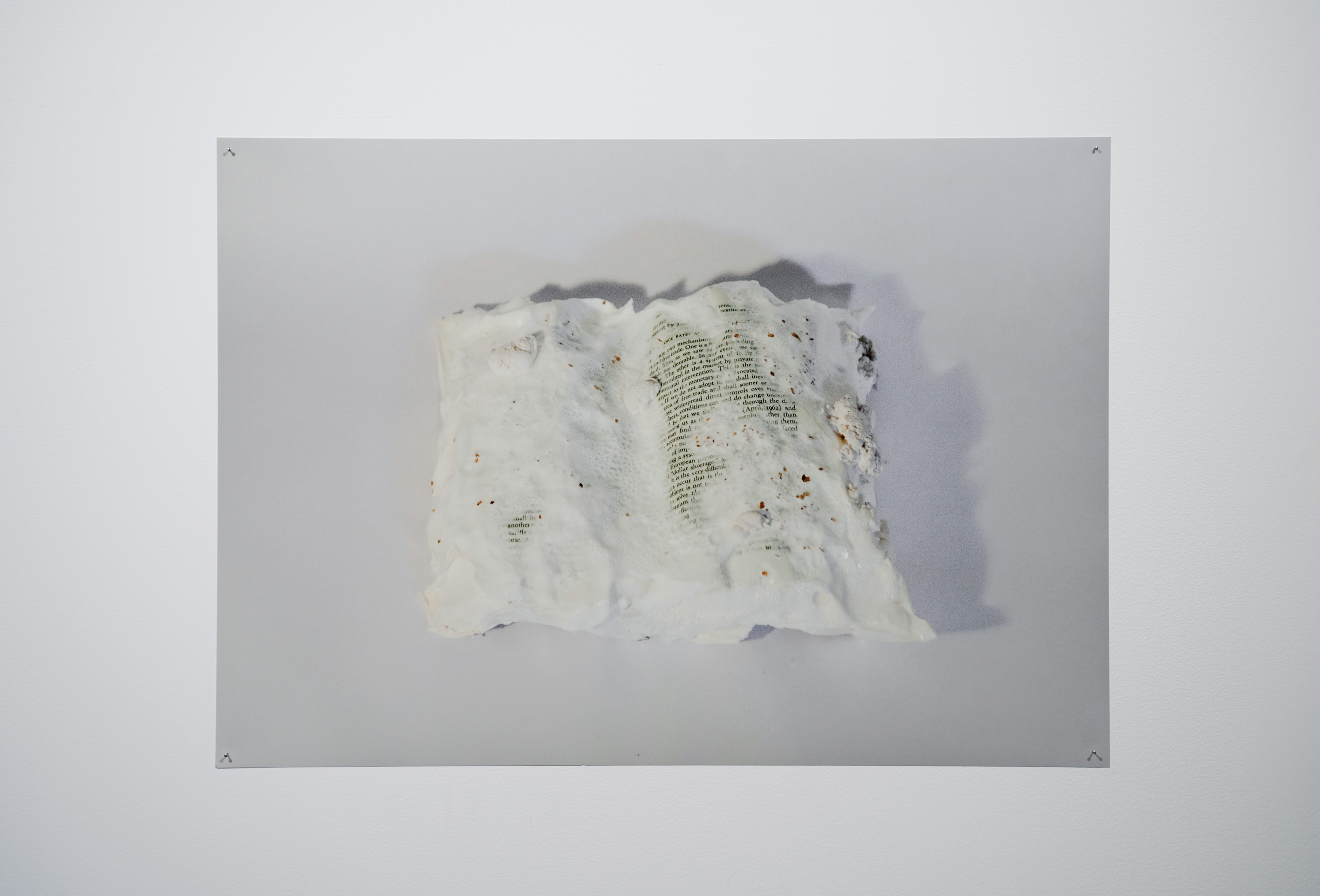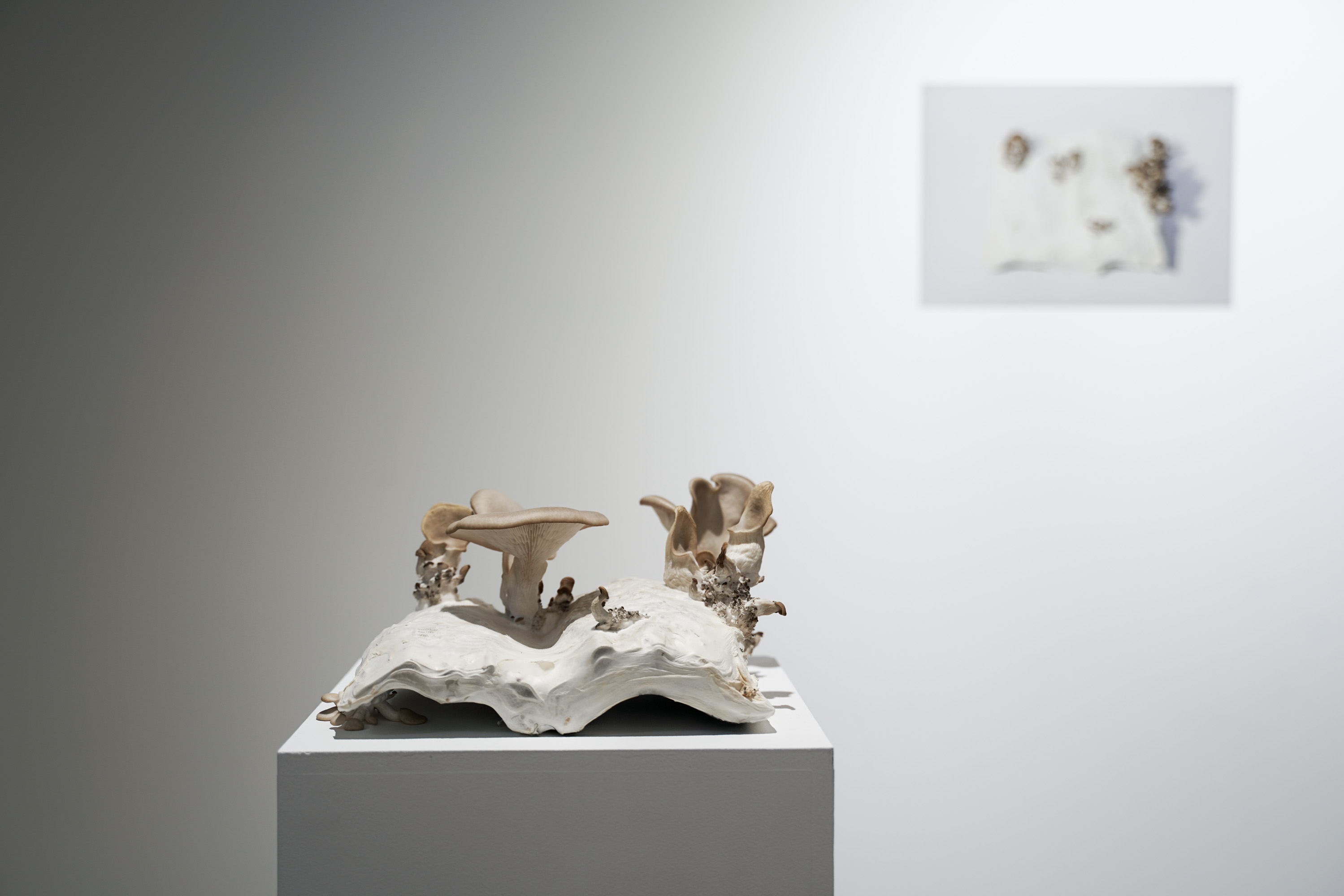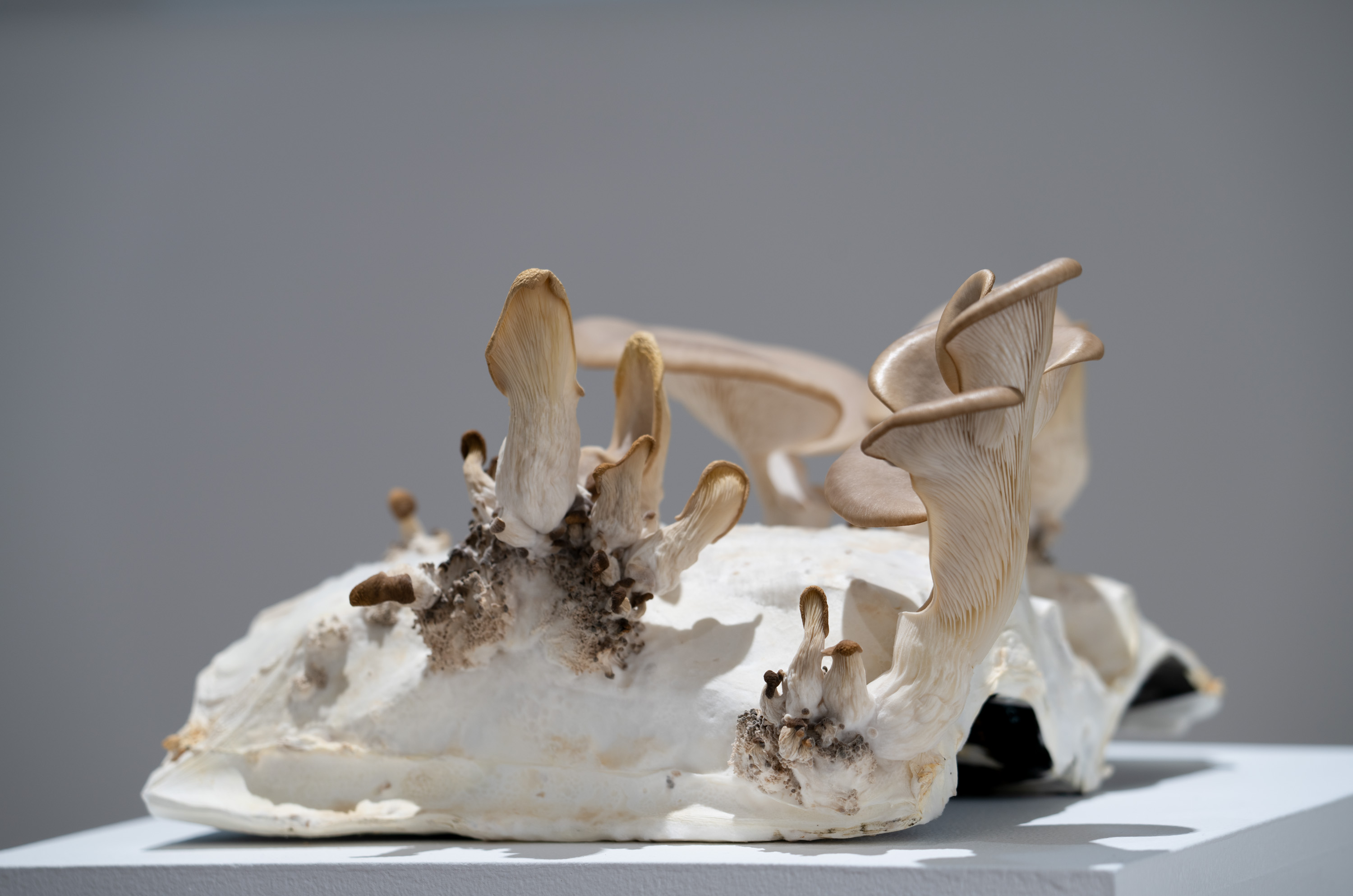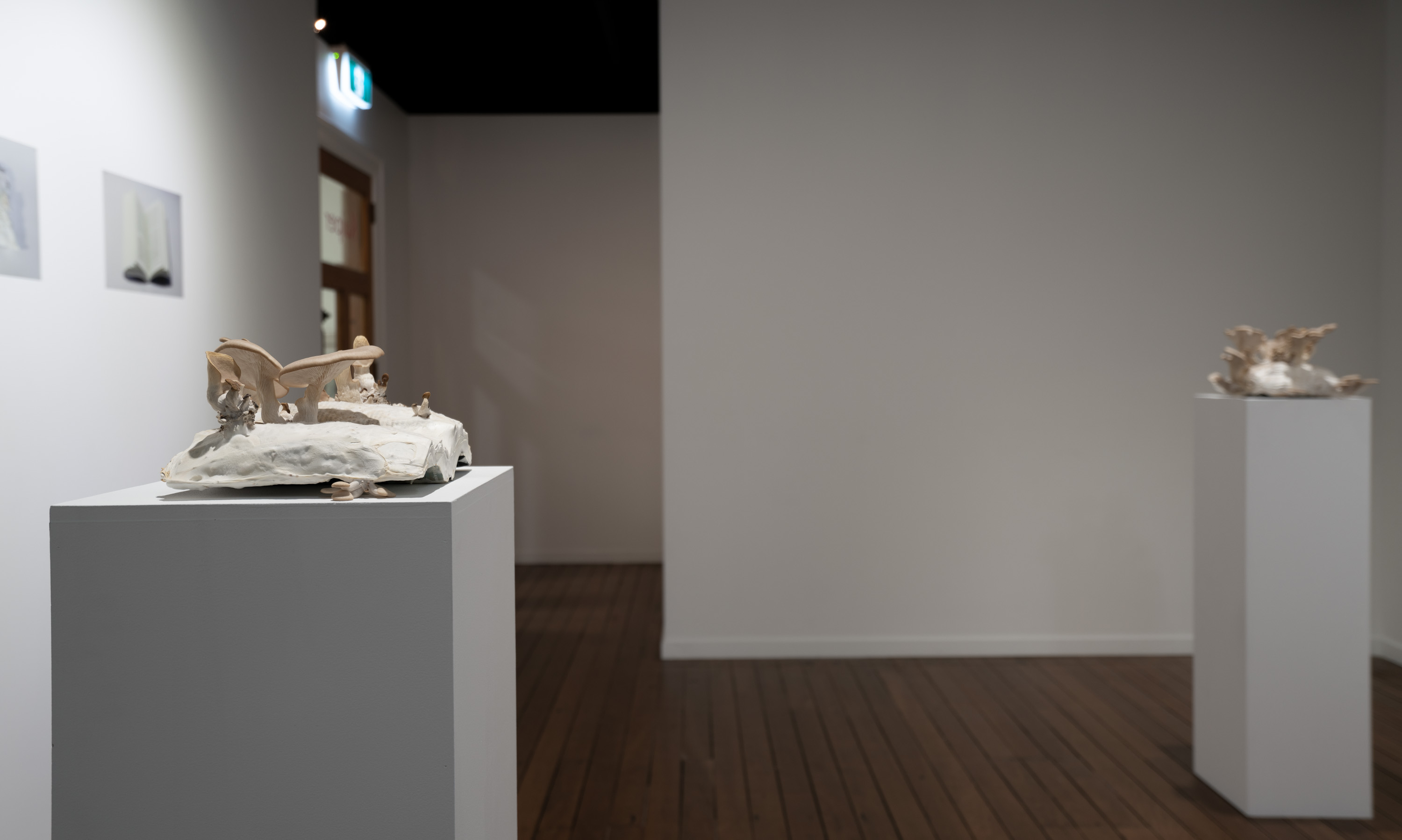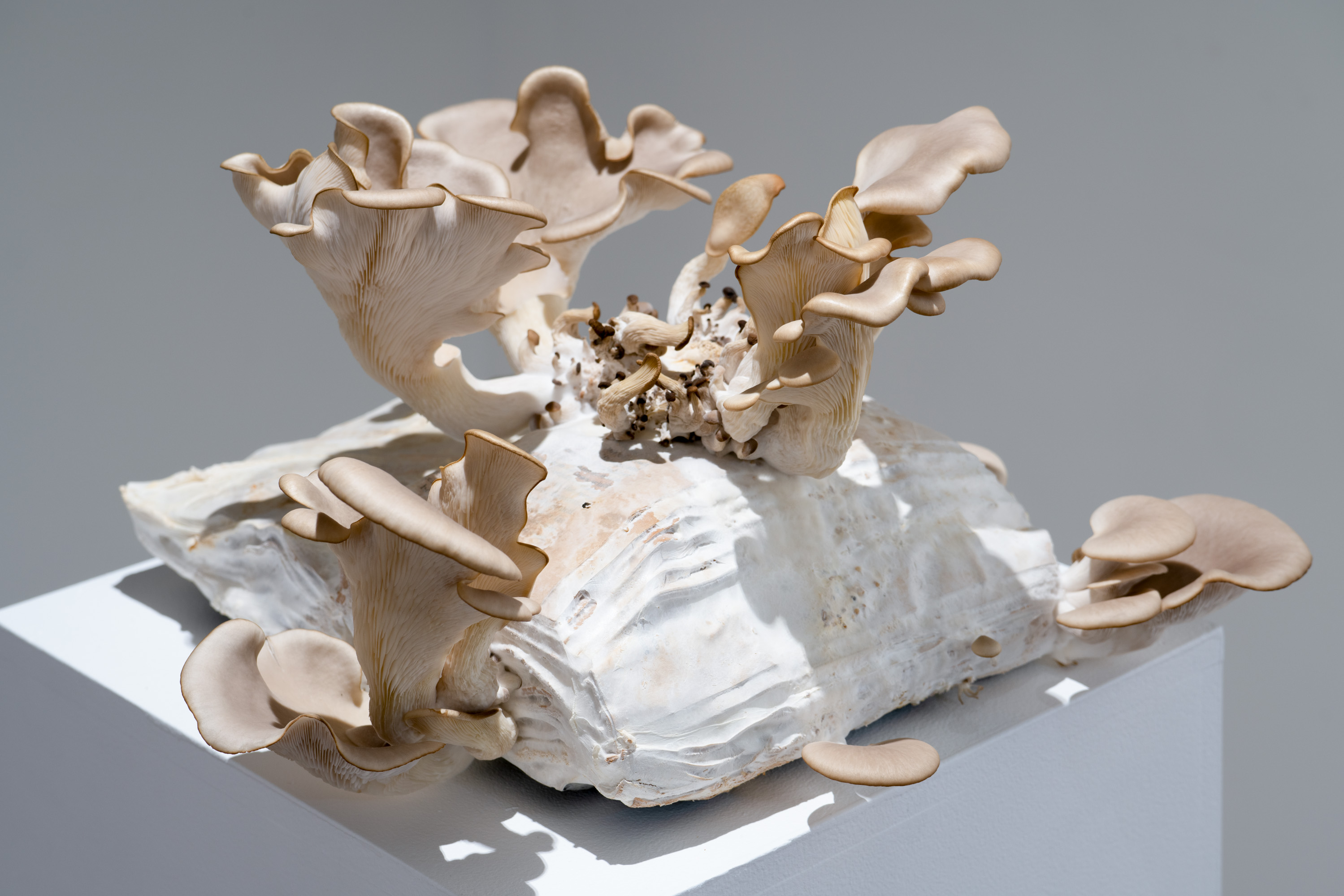 In Metabolis(h)ing, native oyster mushrooms decompose and metabolise three seminal capitalist texts. Plumes of interconnecting mycelial threads envelop the books, transmuting their physical and conceptual contents into sustenance for the fungi’s fruiting bodies to grow. These mycelium networks are woven beneath/through all spaces we encounter. Ever-branching, connecting individual beings in rhizomatic webs of reciprocity, transmuting death into regenerative energy, and redistributing surplus wealth throughout interspecies communities. The ephemeral bodies of fungi emerge from decaying matter, reminders of the unseen web of relations that exists beneath/beyond all surface life, connecting us all.