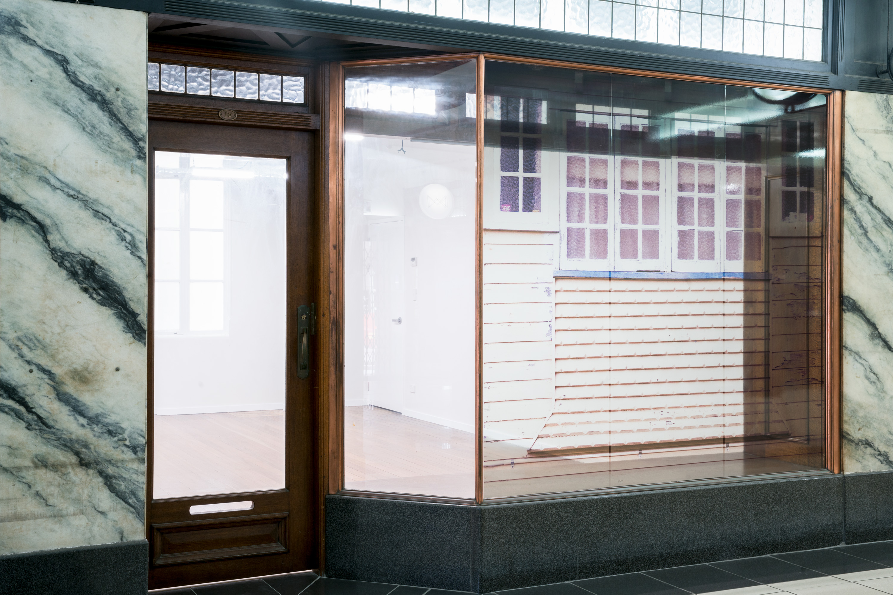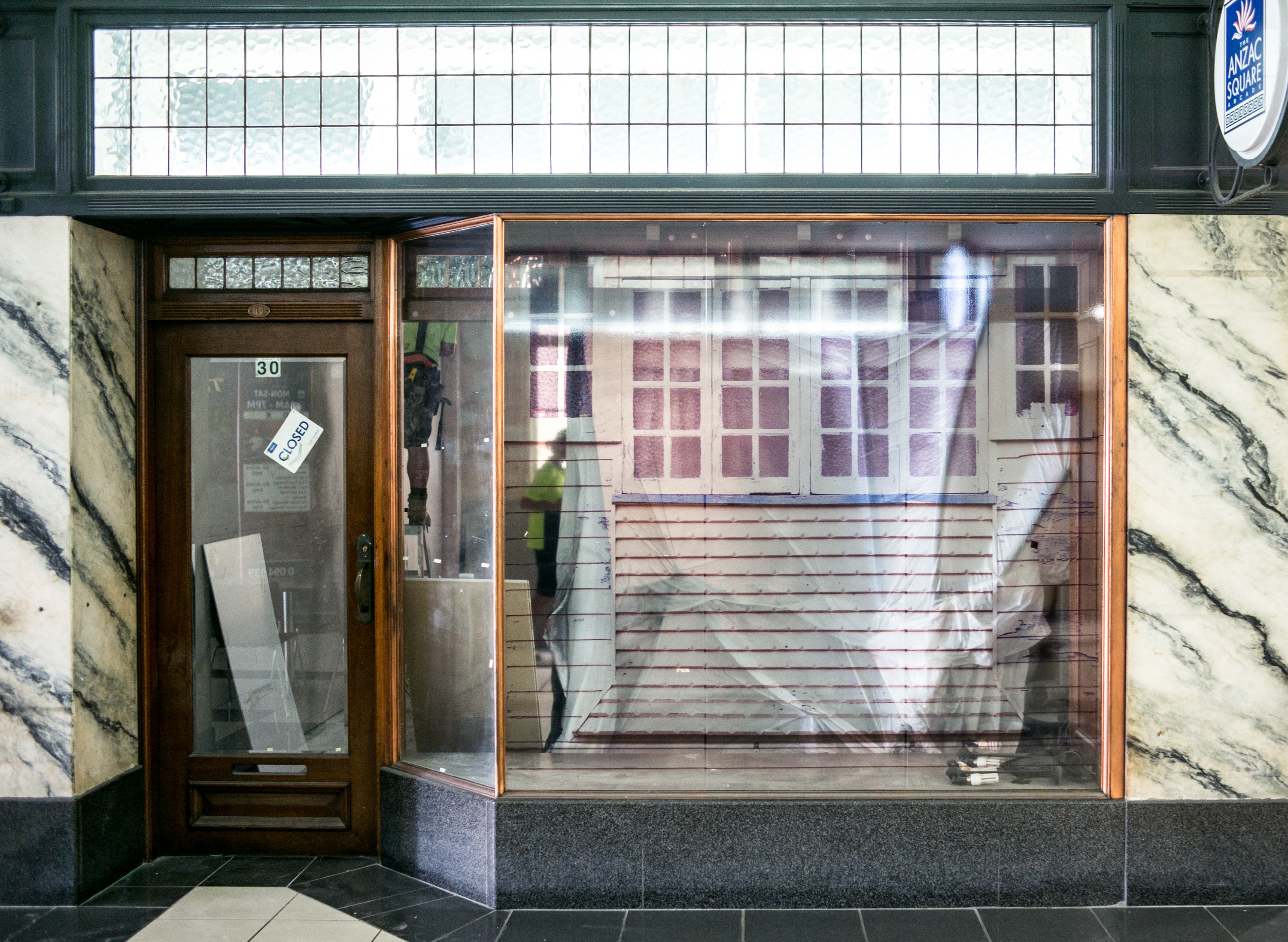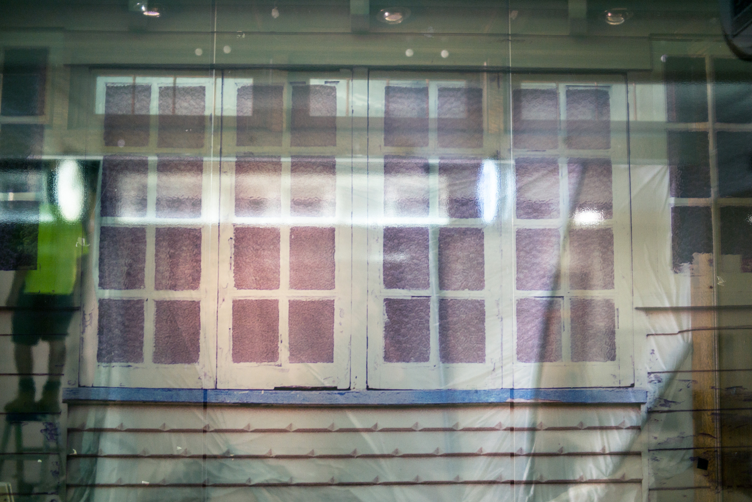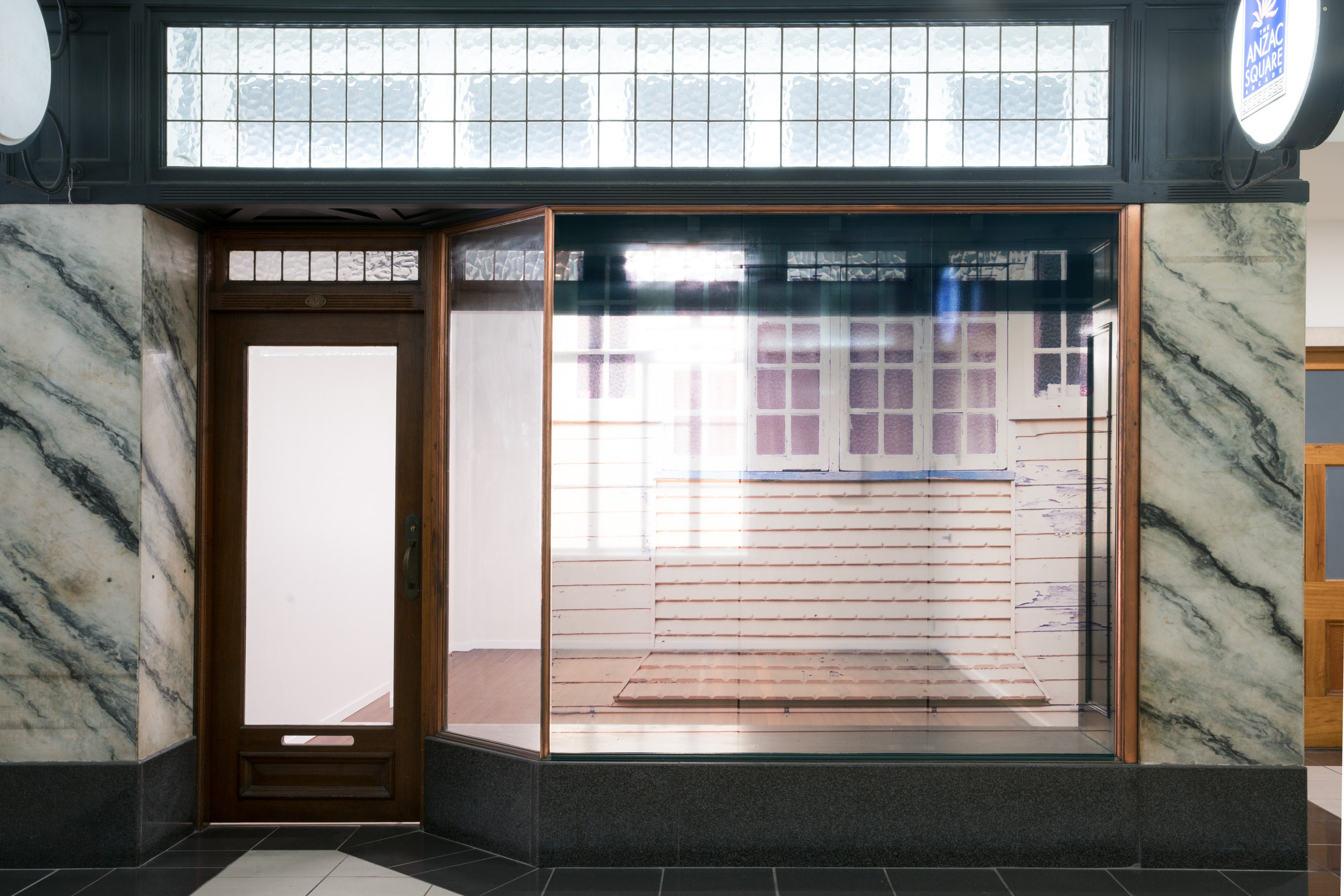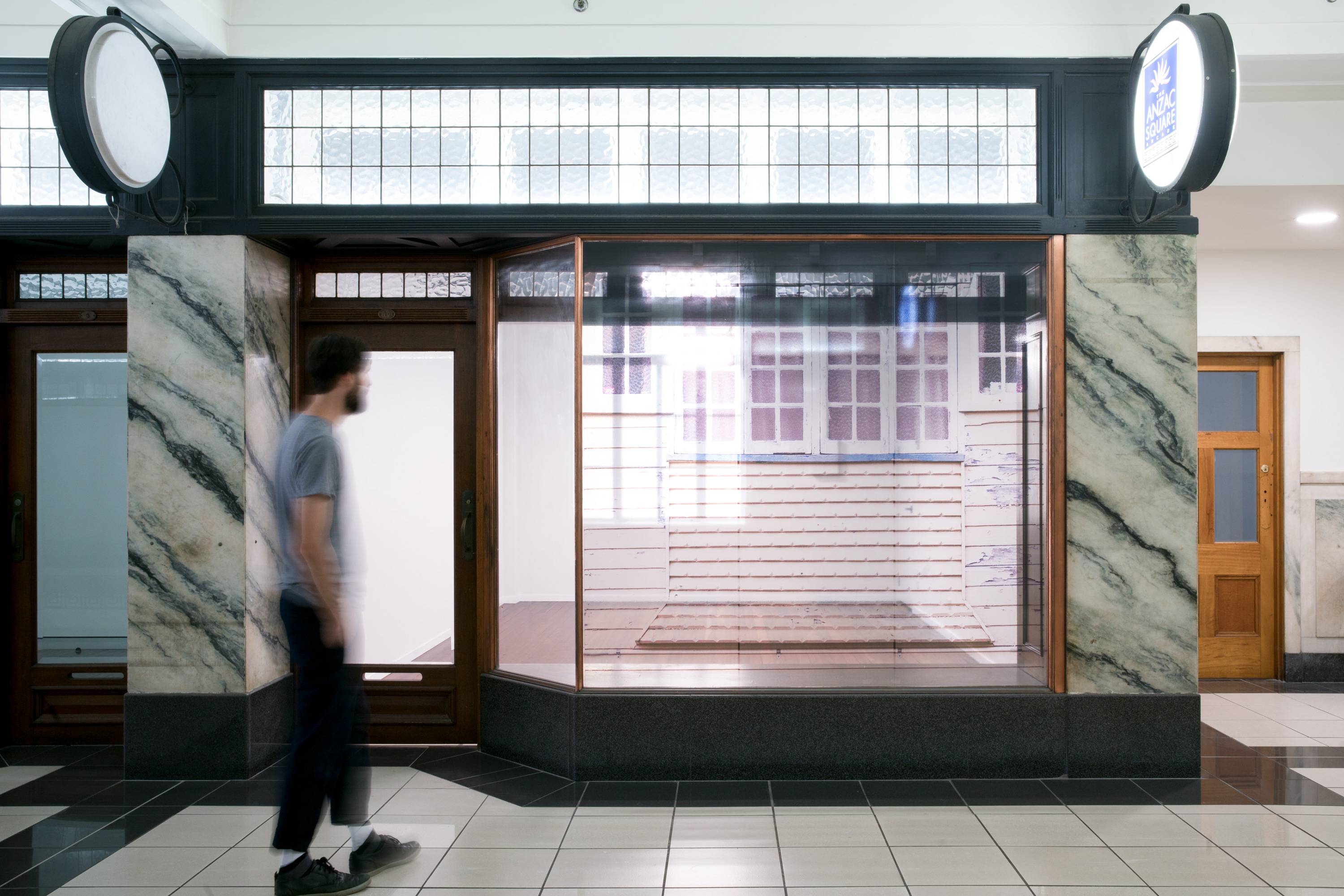 'Renovation' sees the window space covered in a translucent detail of the front of a ‘Queenslander’ house. The translucent material creates an interplay between the image, and the ongoing renovation work occurring physically in the space behind it, reframing the renovation as a performance of everyday life.
