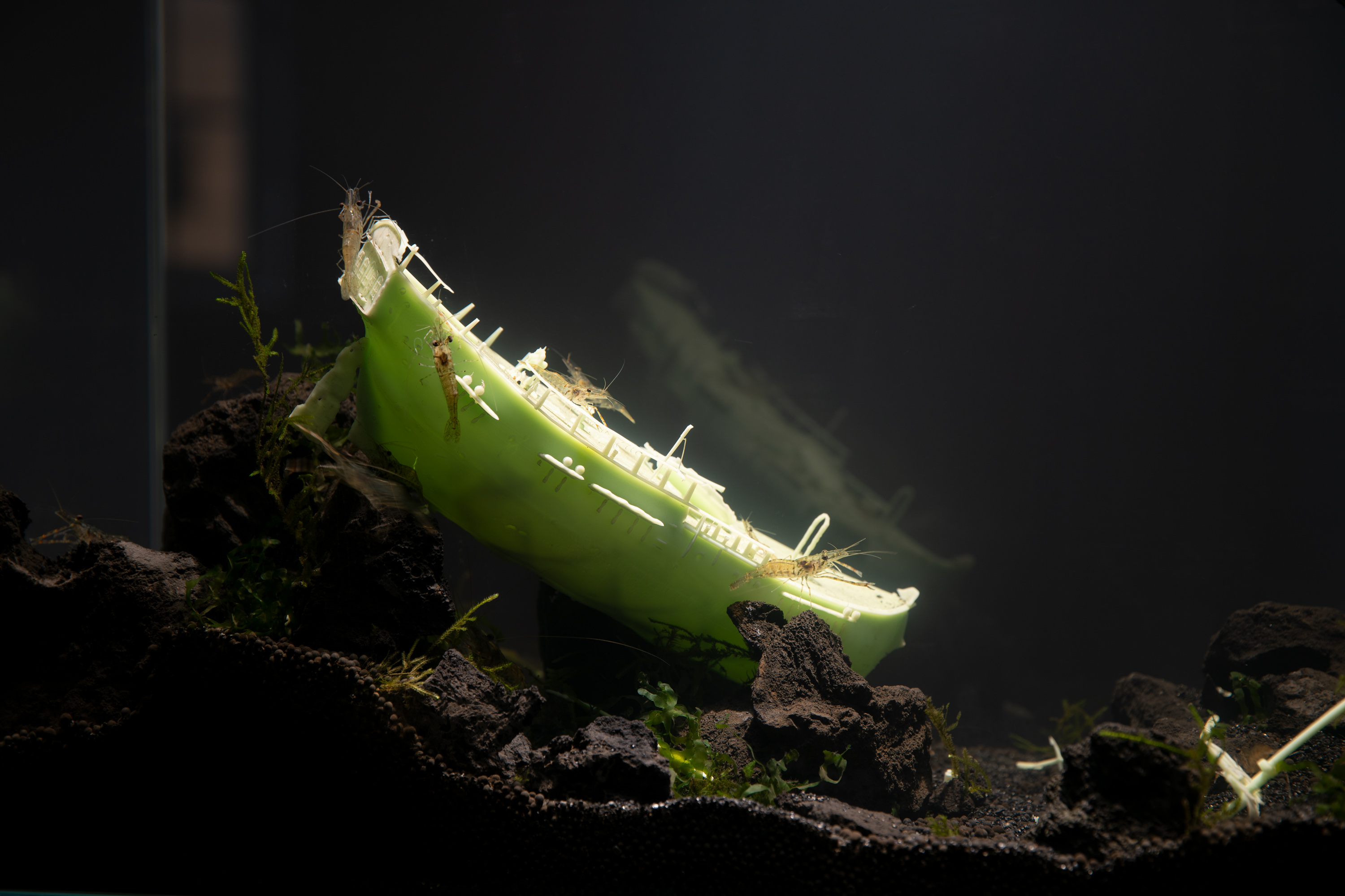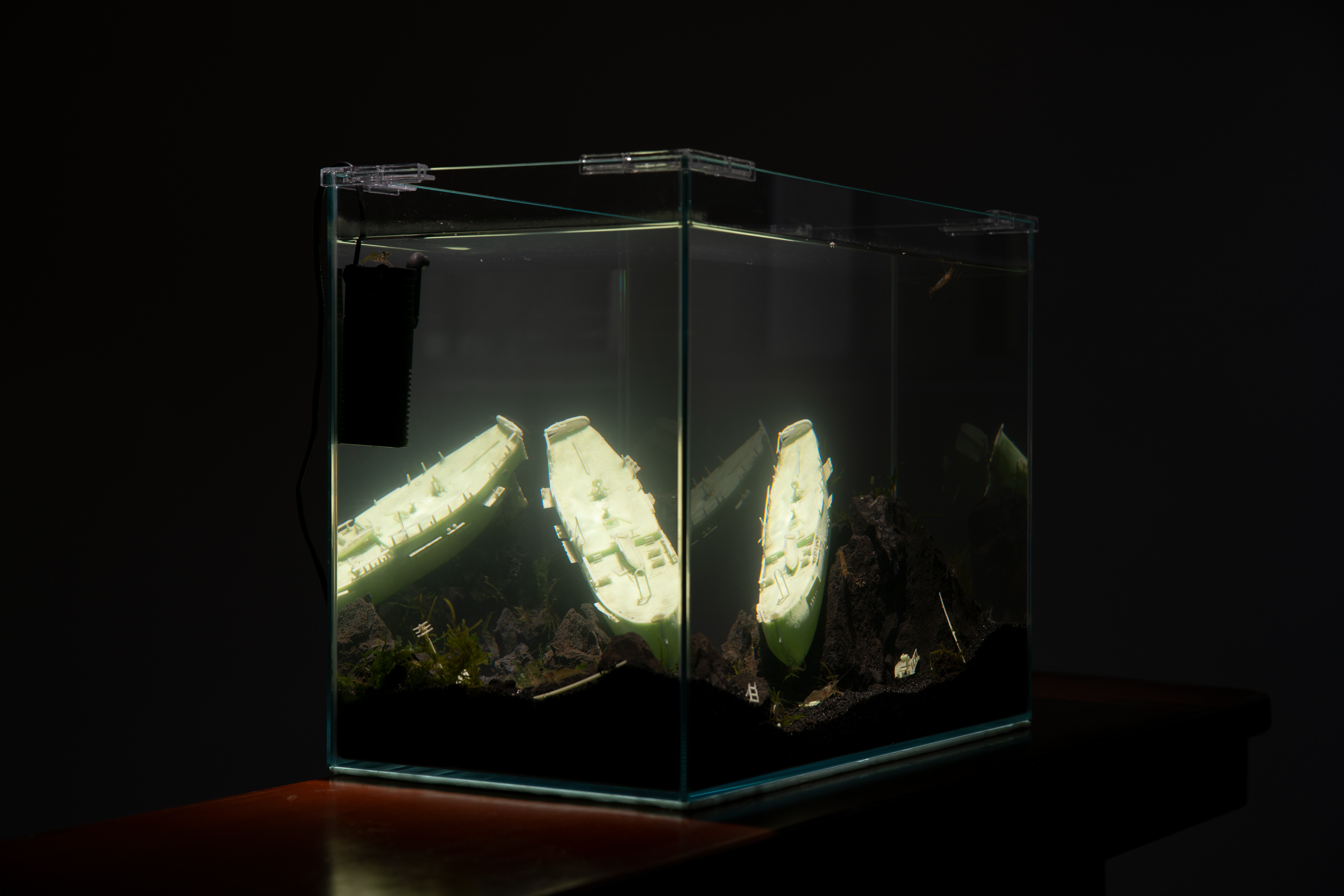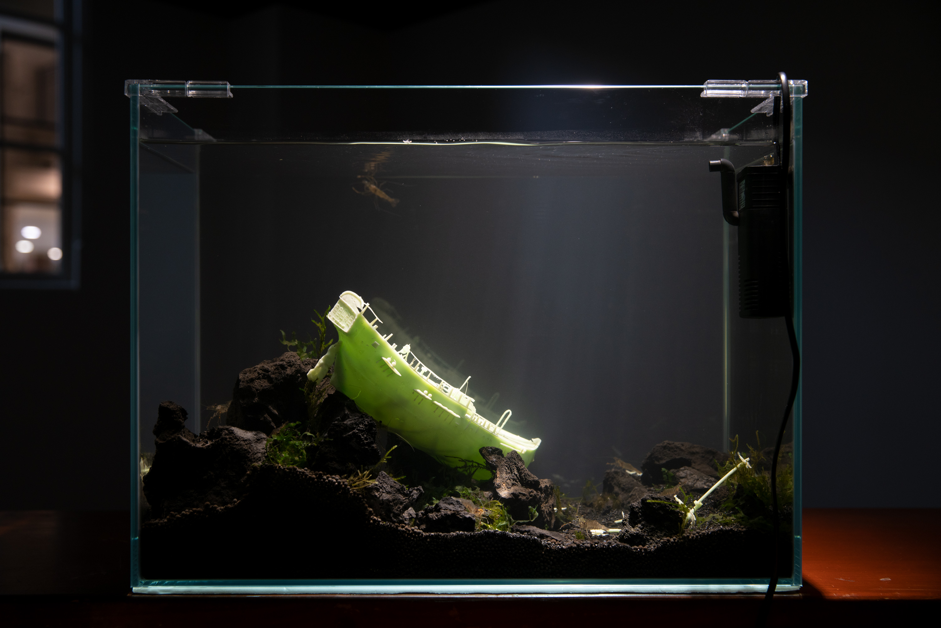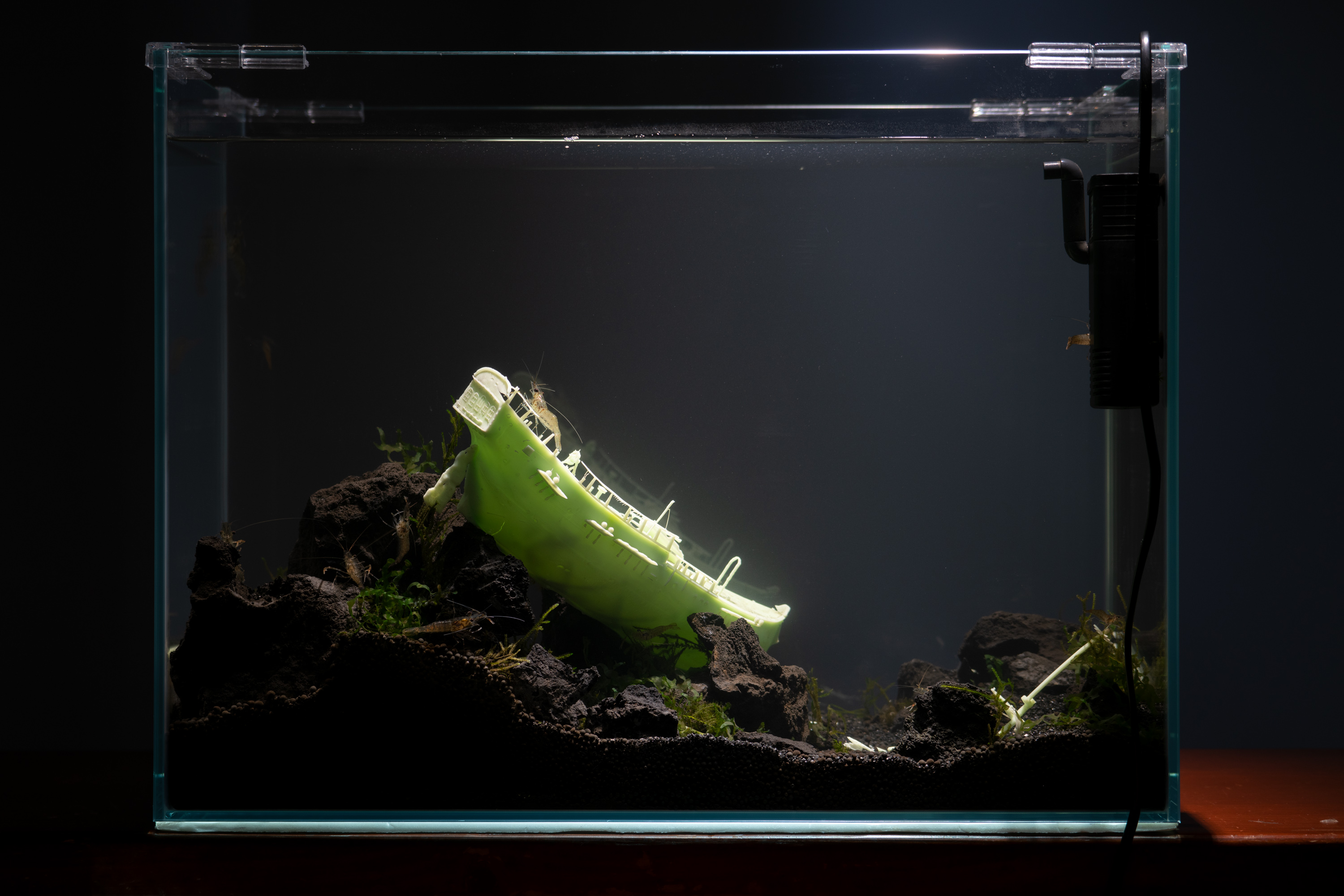 The exhibition utilizes the aesthetics of the pub and curated environments (tanks, displays, exhibits etc.) to contain and subvert the imagery of colonial machismo. A scale model of the HMS Endeavour rendered as a ghost ship sits at the bottom of a fishtank filled with a barren black sand landscape, placed on a bar countertop. This aquascape is inhabited by a horde of shrimp, perhaps signalling a monstrous revenge, eats at the wreckage of Captain James Cook's beloved vessel.