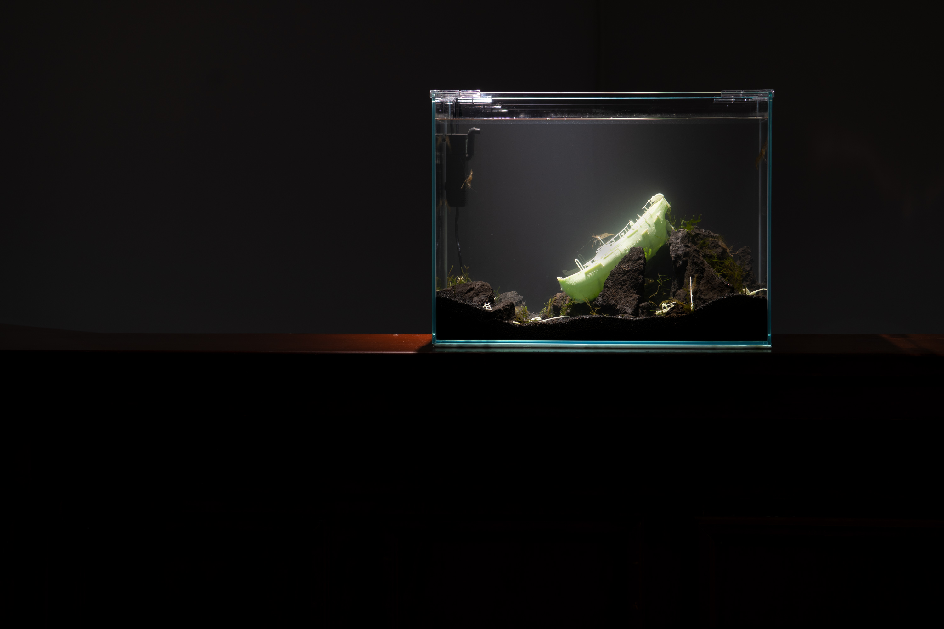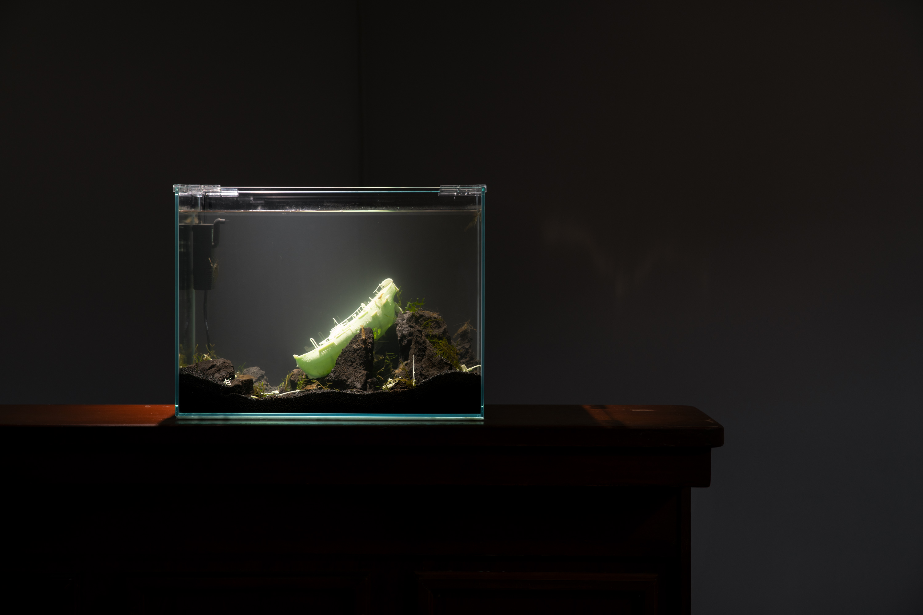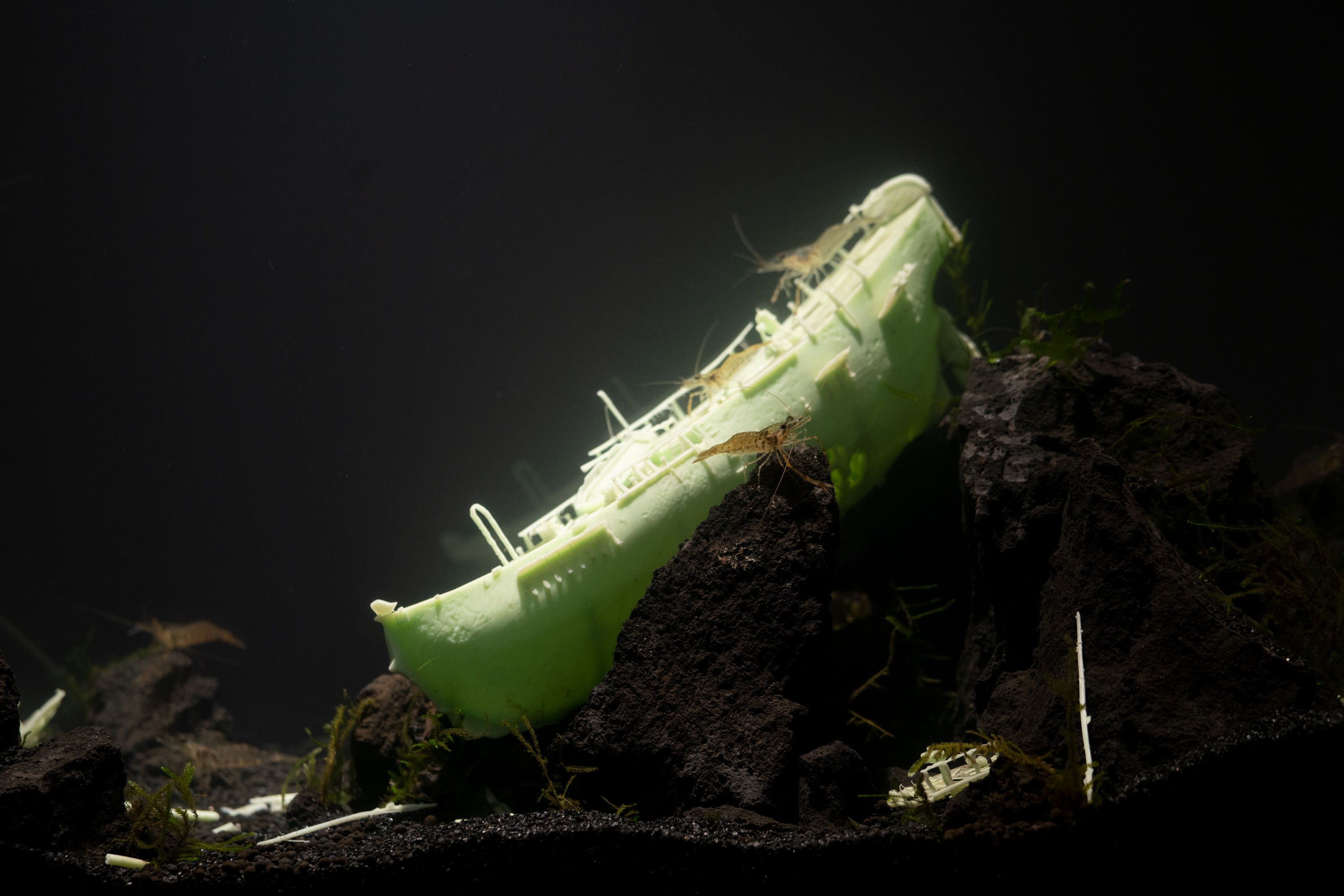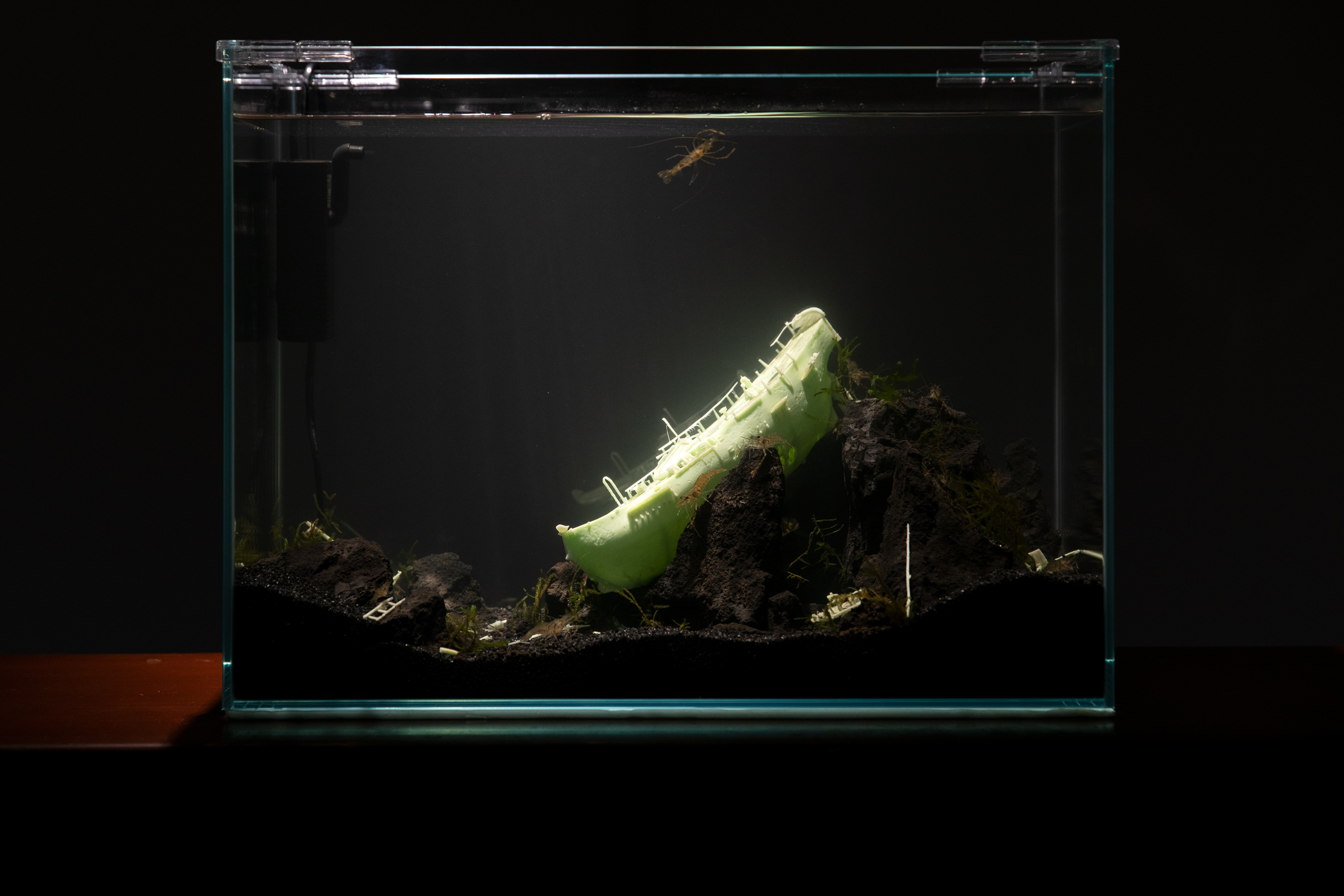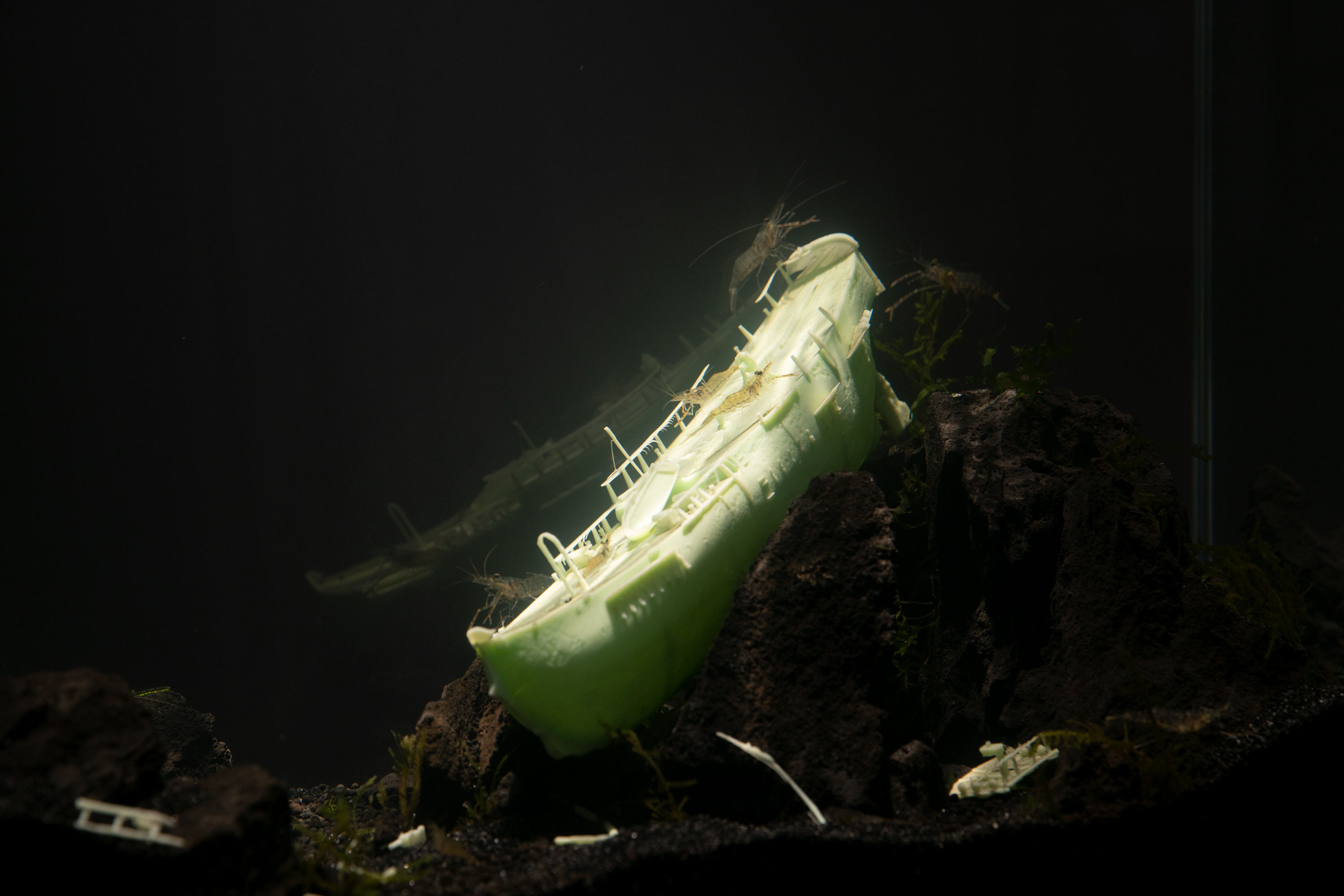 The exhibition utilizes the aesthetics of the pub and curated environments (tanks, displays, exhibits etc.) to contain and subvert the imagery of colonial machismo. A scale model of the HMS Endeavour rendered as a ghost ship sits at the bottom of a fishtank filled with a barren black sand landscape, placed on a bar countertop. This aquascape is inhabited by a horde of shrimp, perhaps signalling a monstrous revenge, eats at the wreckage of Captain James Cook's beloved vessel.
