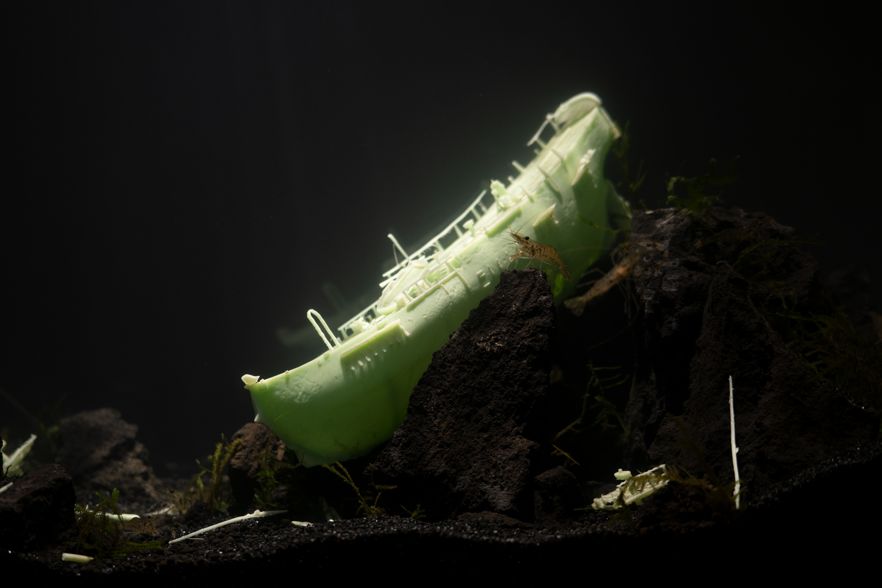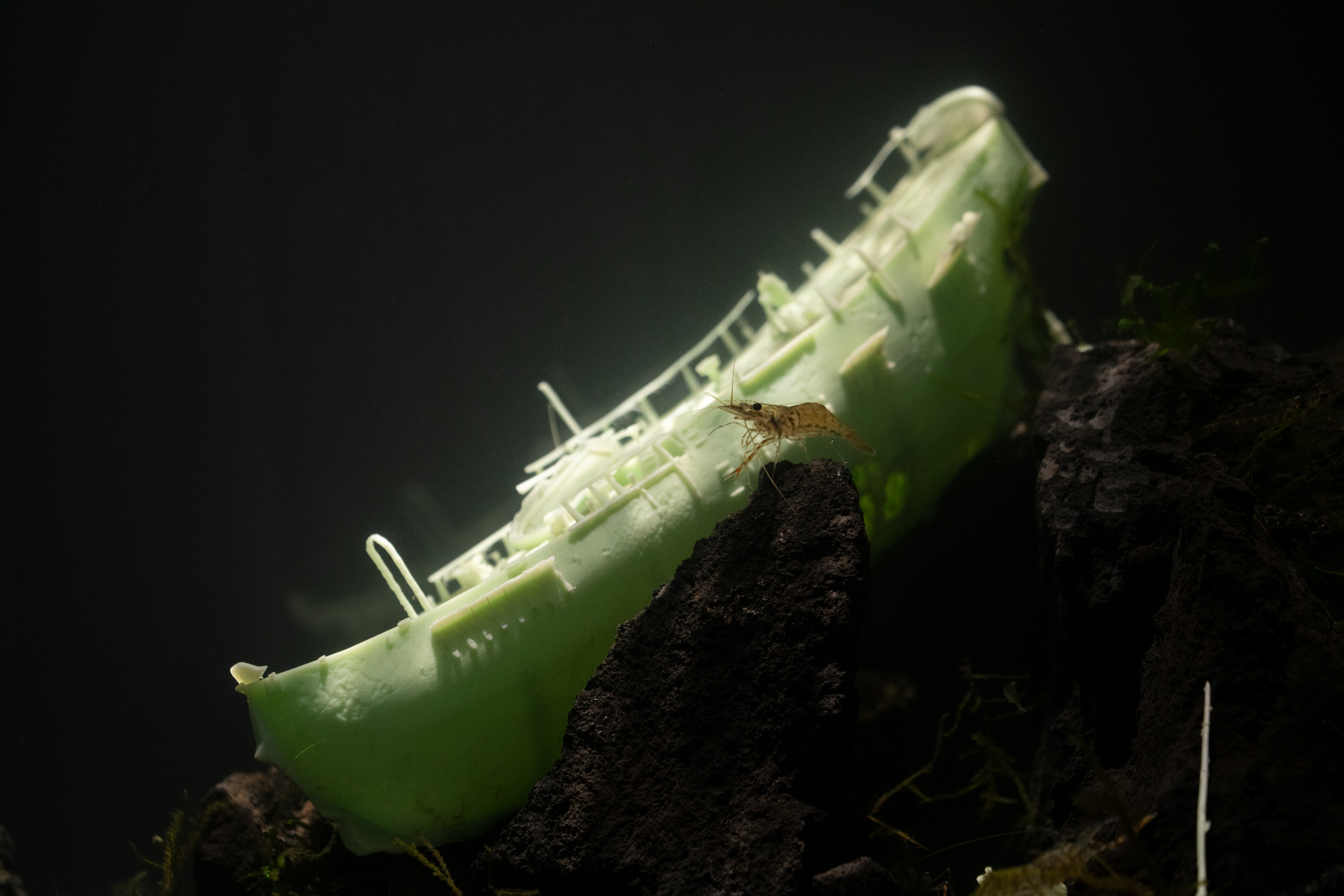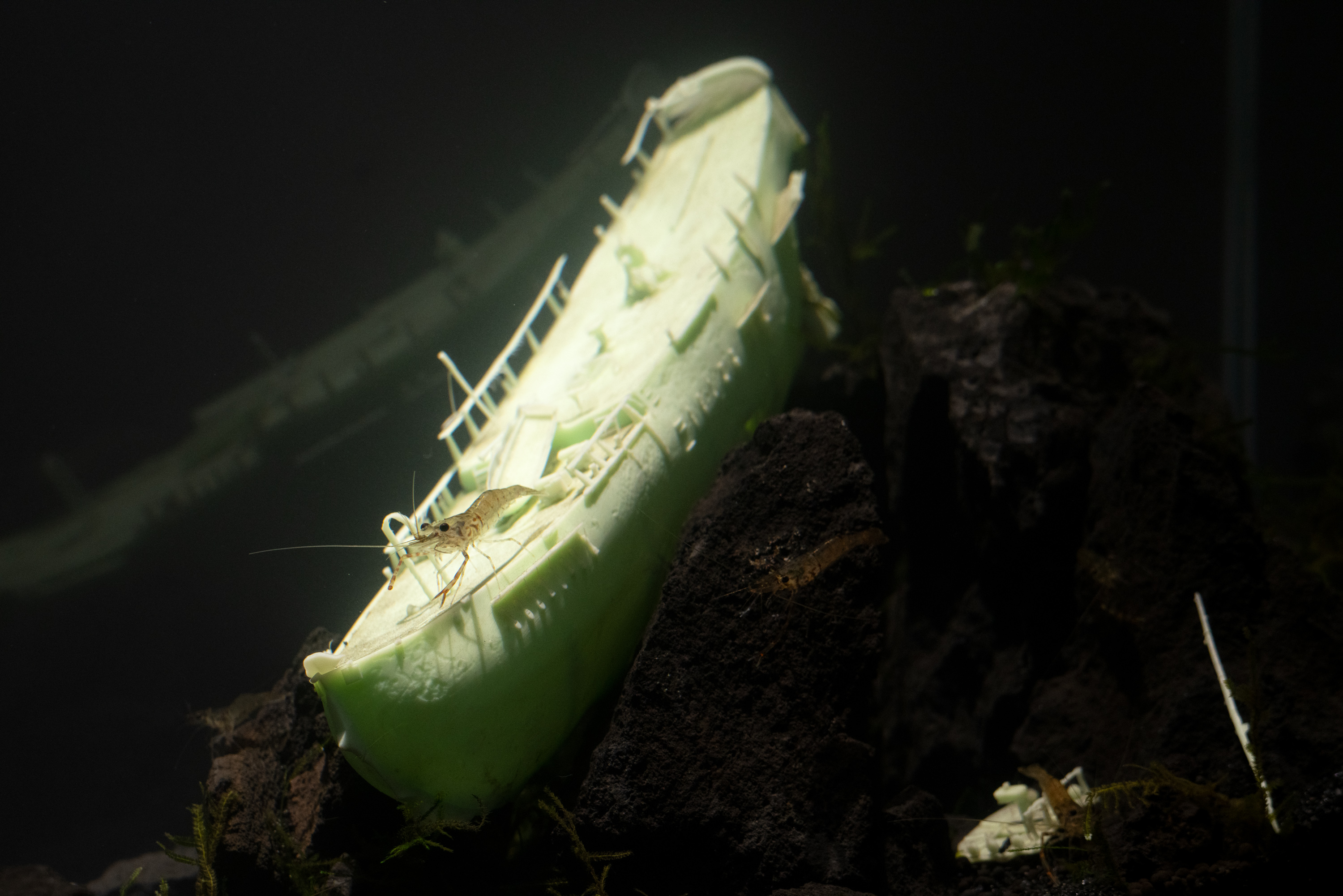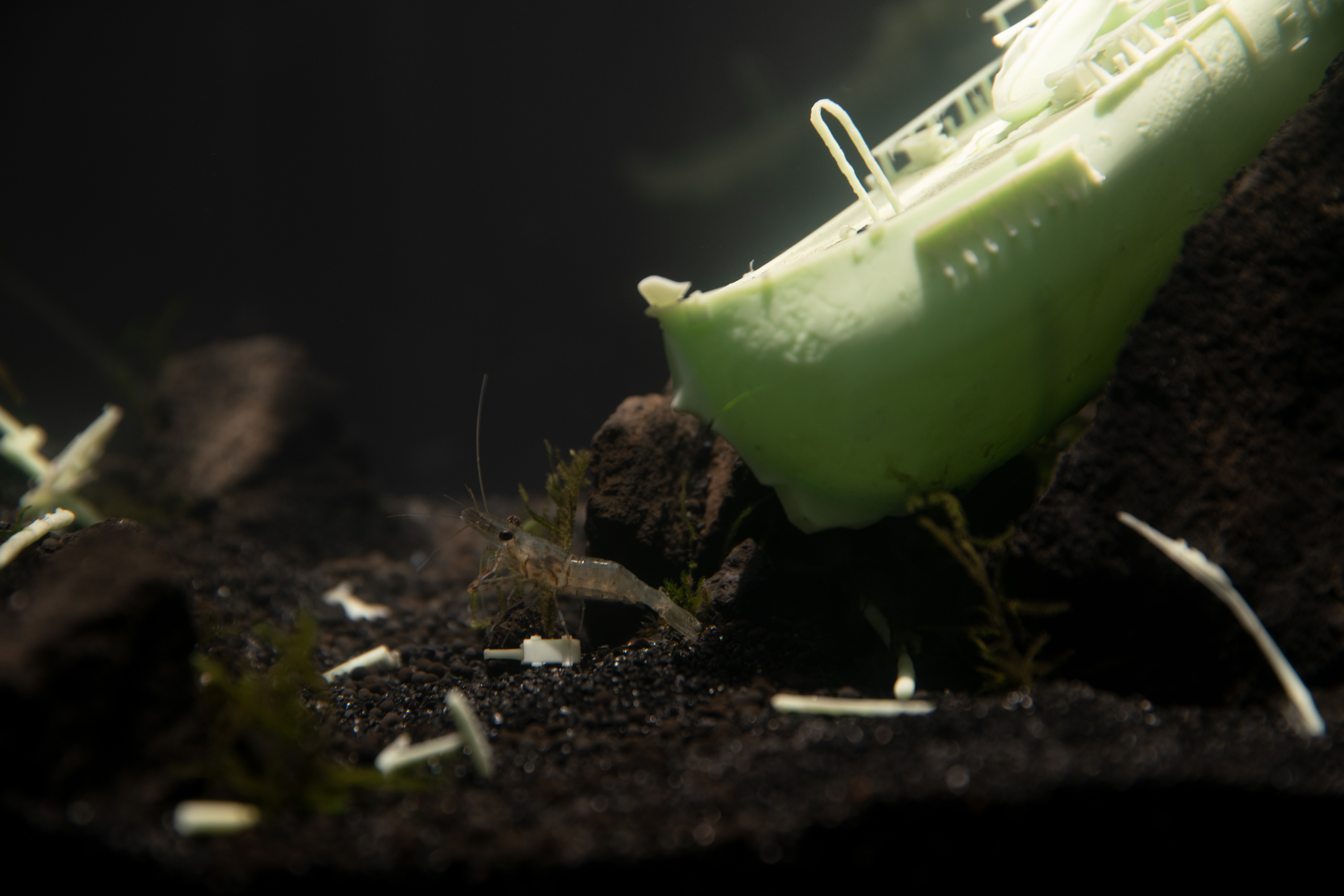 The exhibition utilizes the aesthetics of the pub and curated environments (tanks, displays, exhibits etc.) to contain and subvert the imagery of colonial machismo. A scale model of the HMS Endeavour rendered as a ghost ship sits at the bottom of a fishtank filled with a barren black sand landscape, placed on a bar countertop. This aquascape is inhabited by a horde of shrimp, perhaps signalling a monstrous revenge, eats at the wreckage of Captain James Cook's beloved vessel.