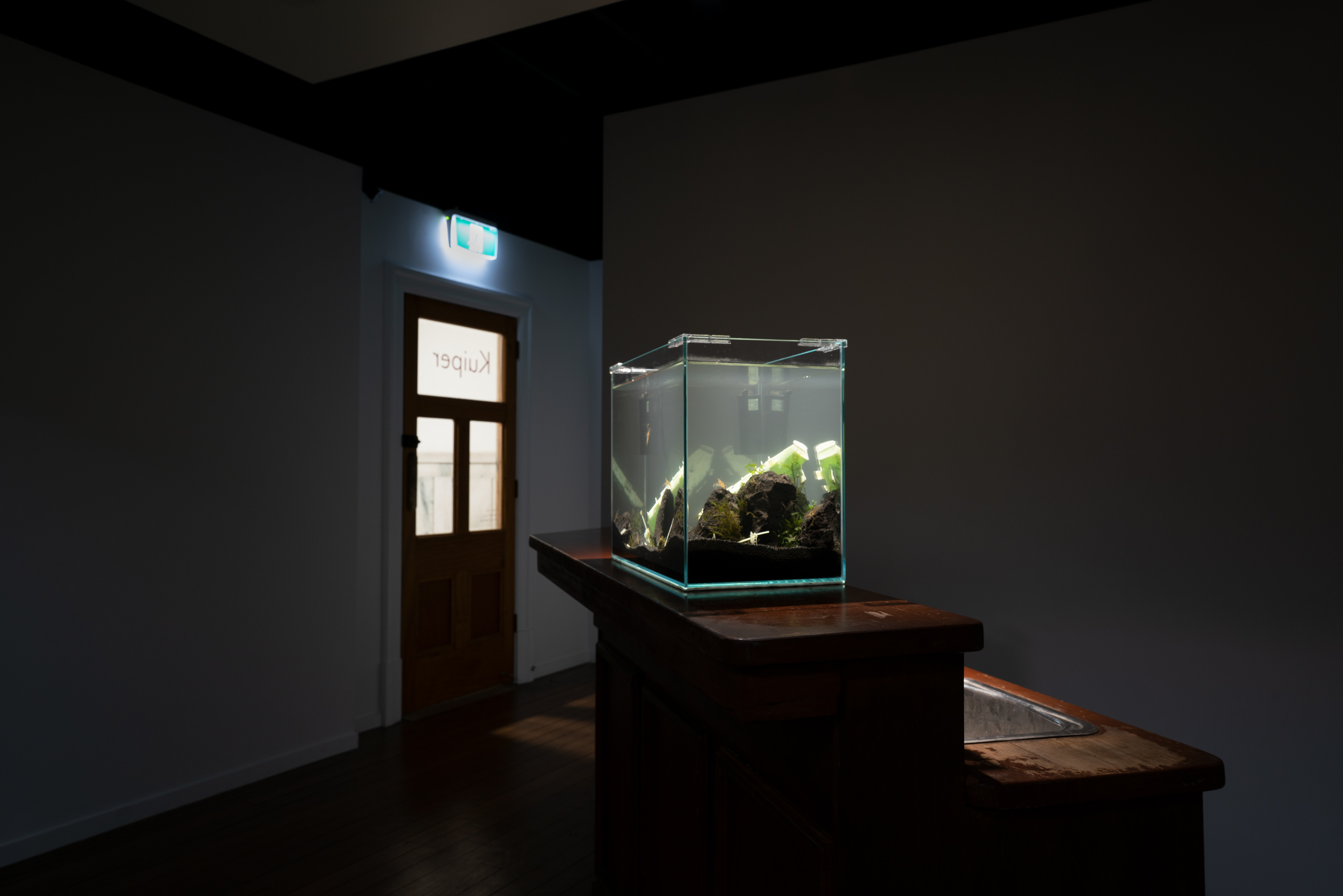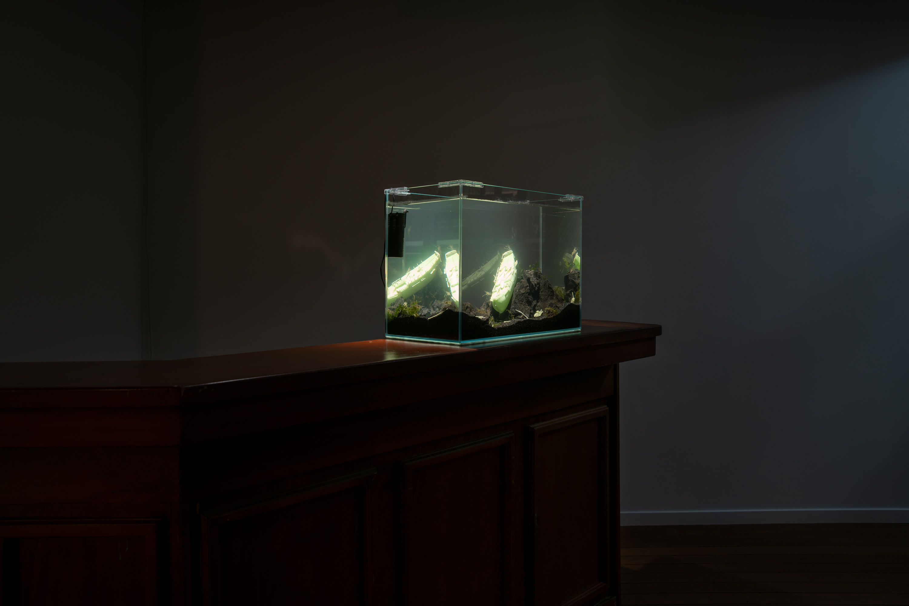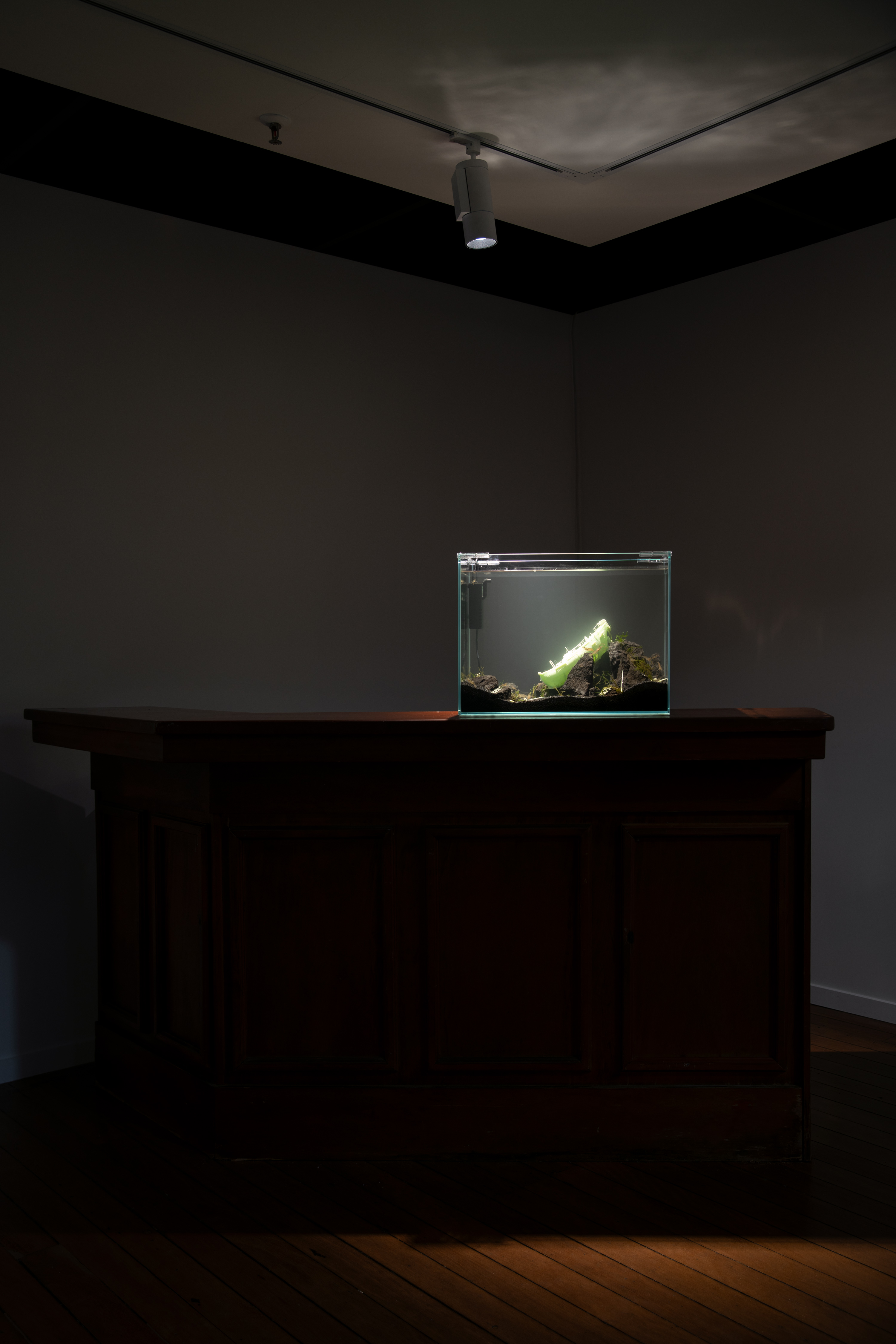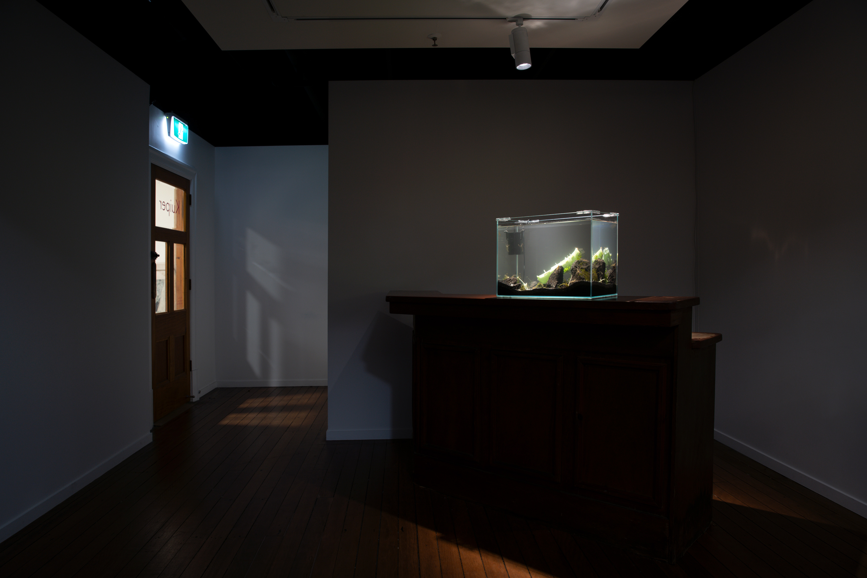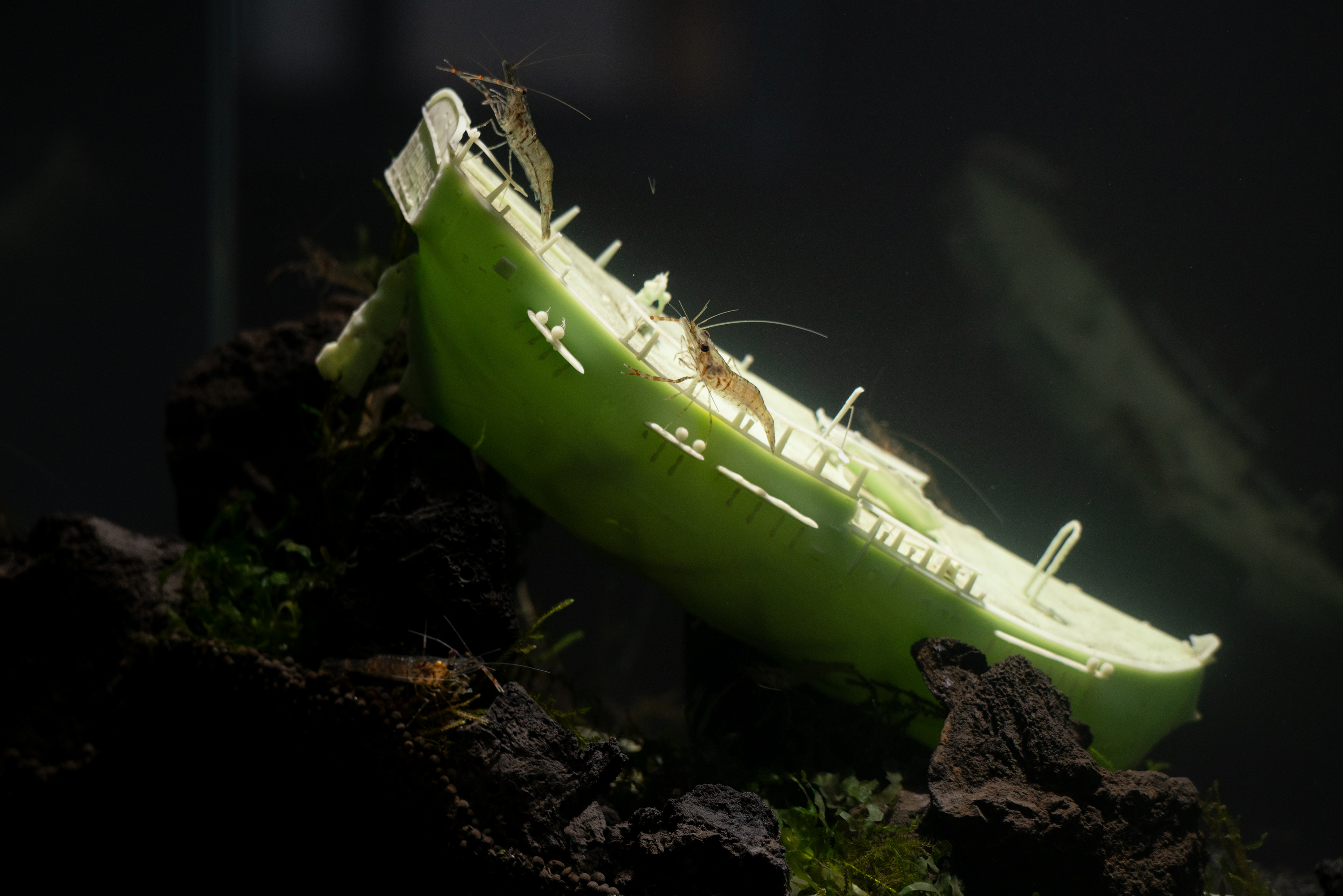 The exhibition utilizes the aesthetics of the pub and curated environments (tanks, displays, exhibits etc.) to contain and subvert the imagery of colonial machismo. A scale model of the HMS Endeavour rendered as a ghost ship sits at the bottom of a fishtank filled with a barren black sand landscape, placed on a bar countertop. This aquascape is inhabited by a horde of shrimp, perhaps signalling a monstrous revenge, eats at the wreckage of Captain James Cook's beloved vessel.