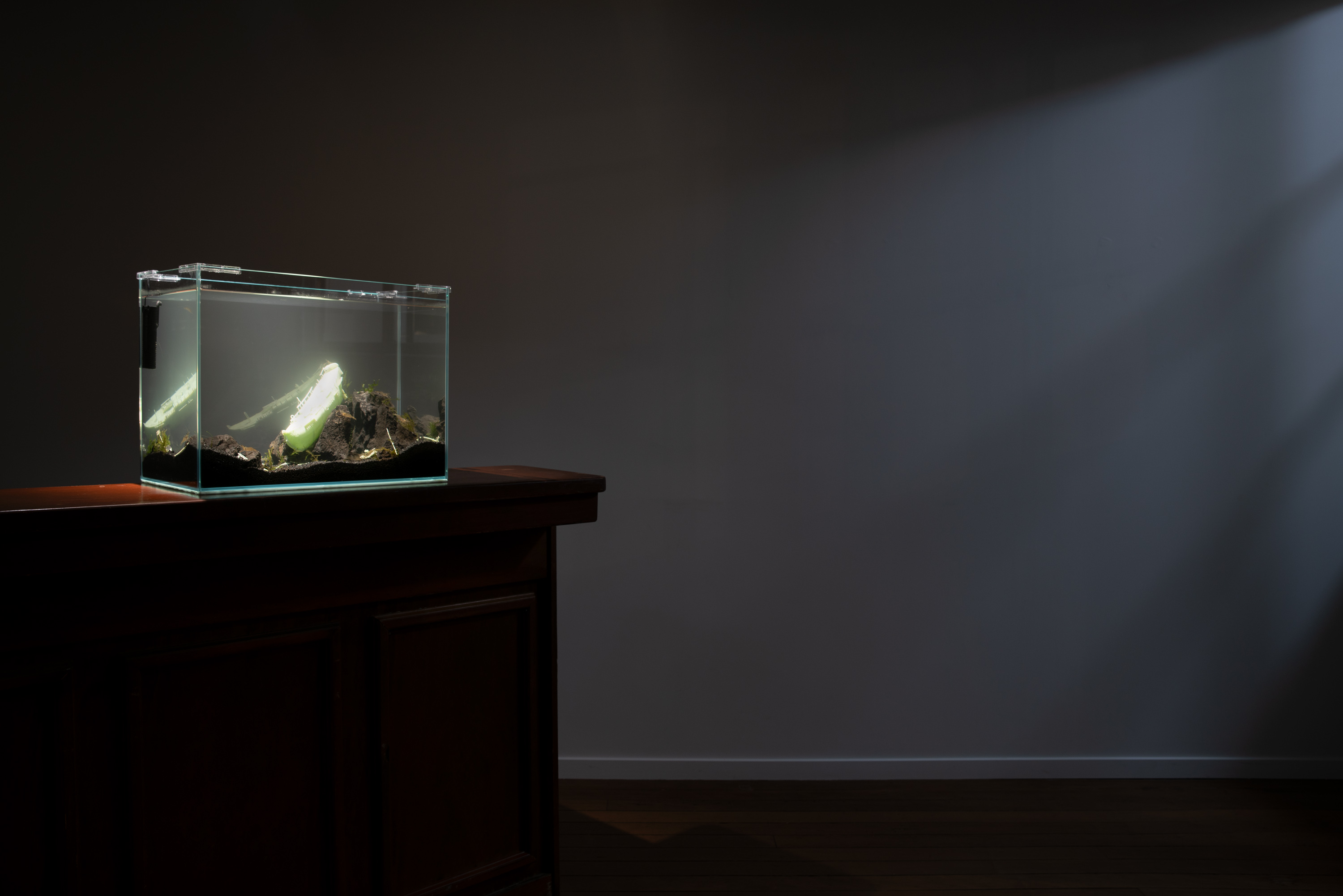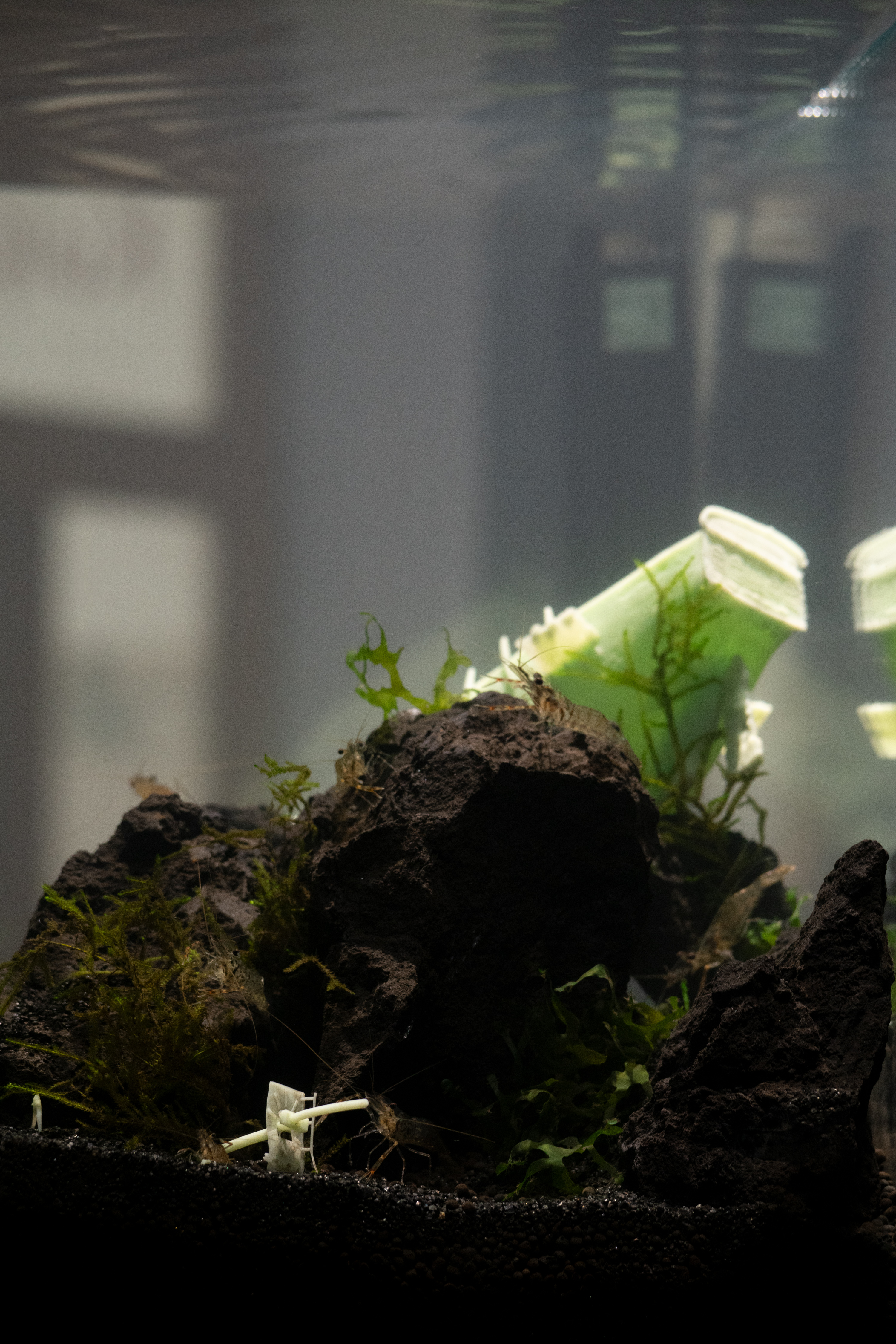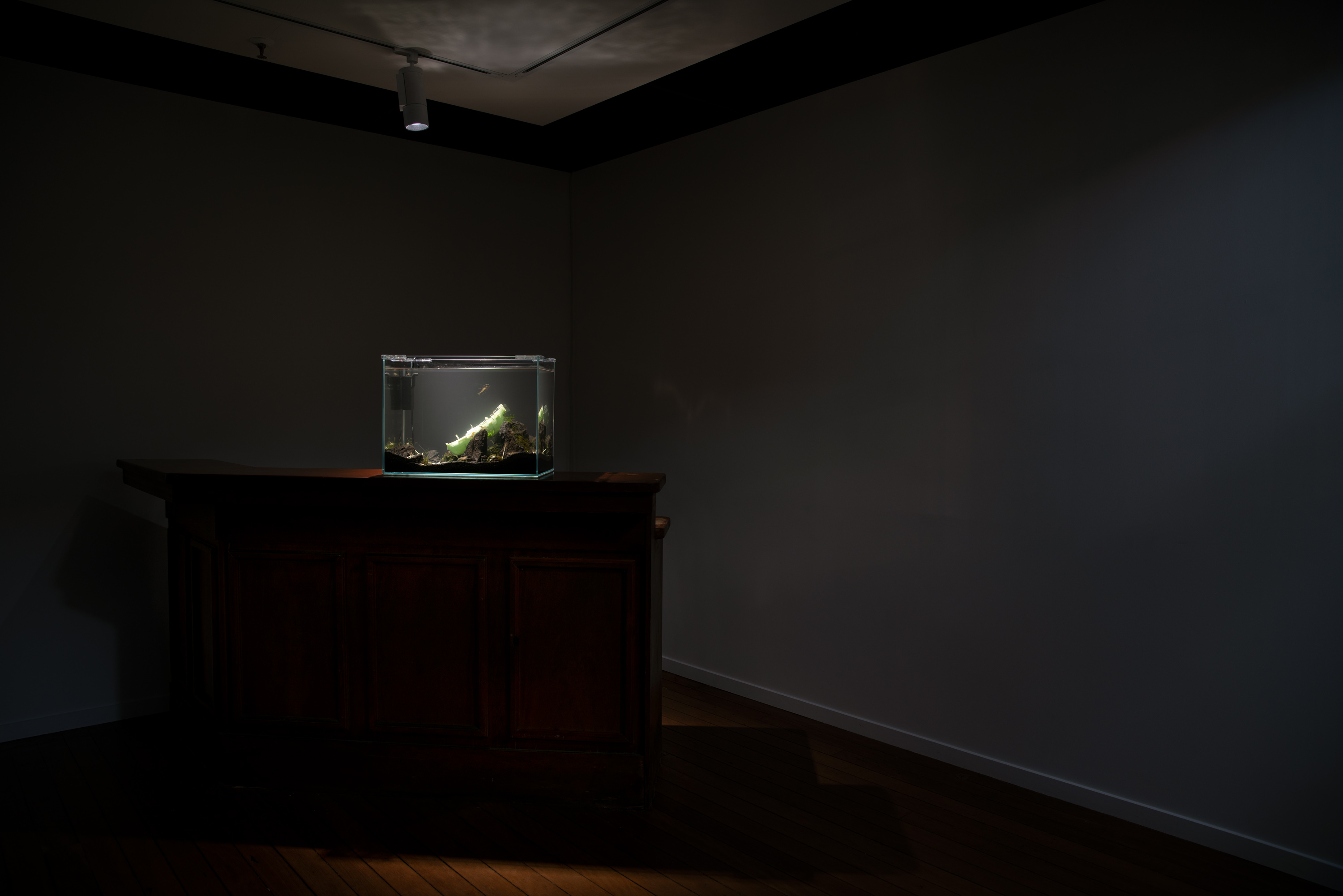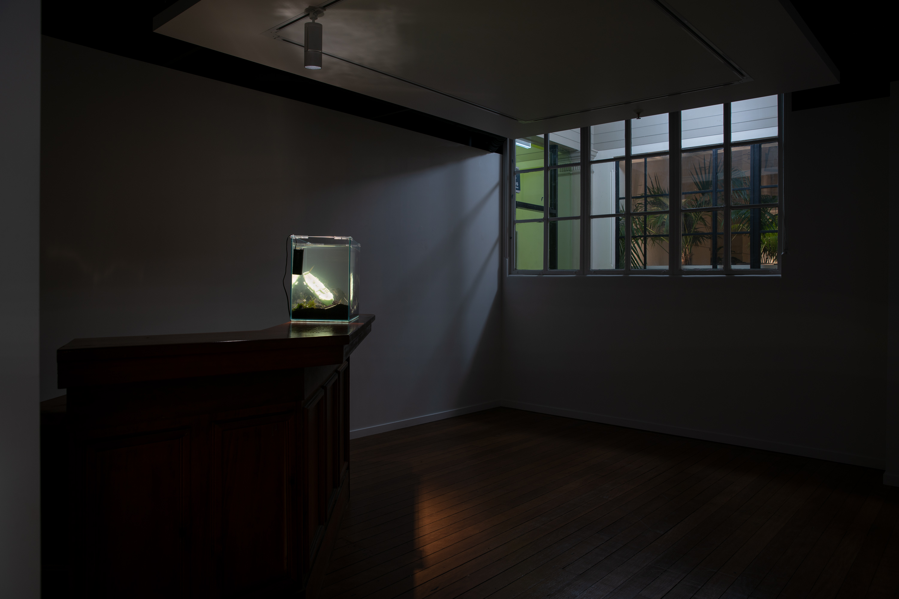 The exhibition utilizes the aesthetics of the pub and curated environments (tanks, displays, exhibits etc.) to contain and subvert the imagery of colonial machismo. A scale model of the HMS Endeavour rendered as a ghost ship sits at the bottom of a fishtank filled with a barren black sand landscape, placed on a bar countertop. This aquascape is inhabited by a horde of shrimp, perhaps signalling a monstrous revenge, eats at the wreckage of Captain James Cook's beloved vessel.