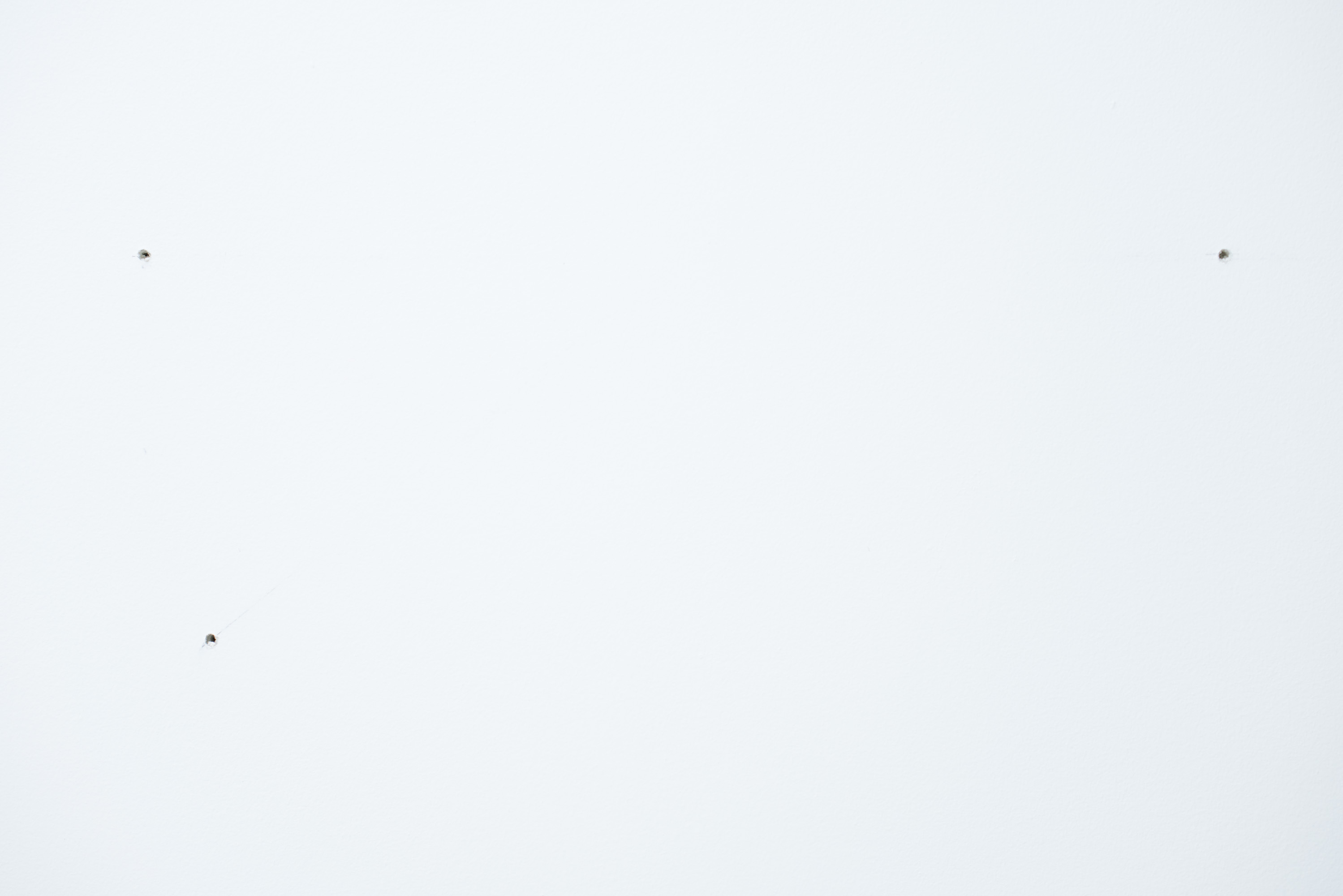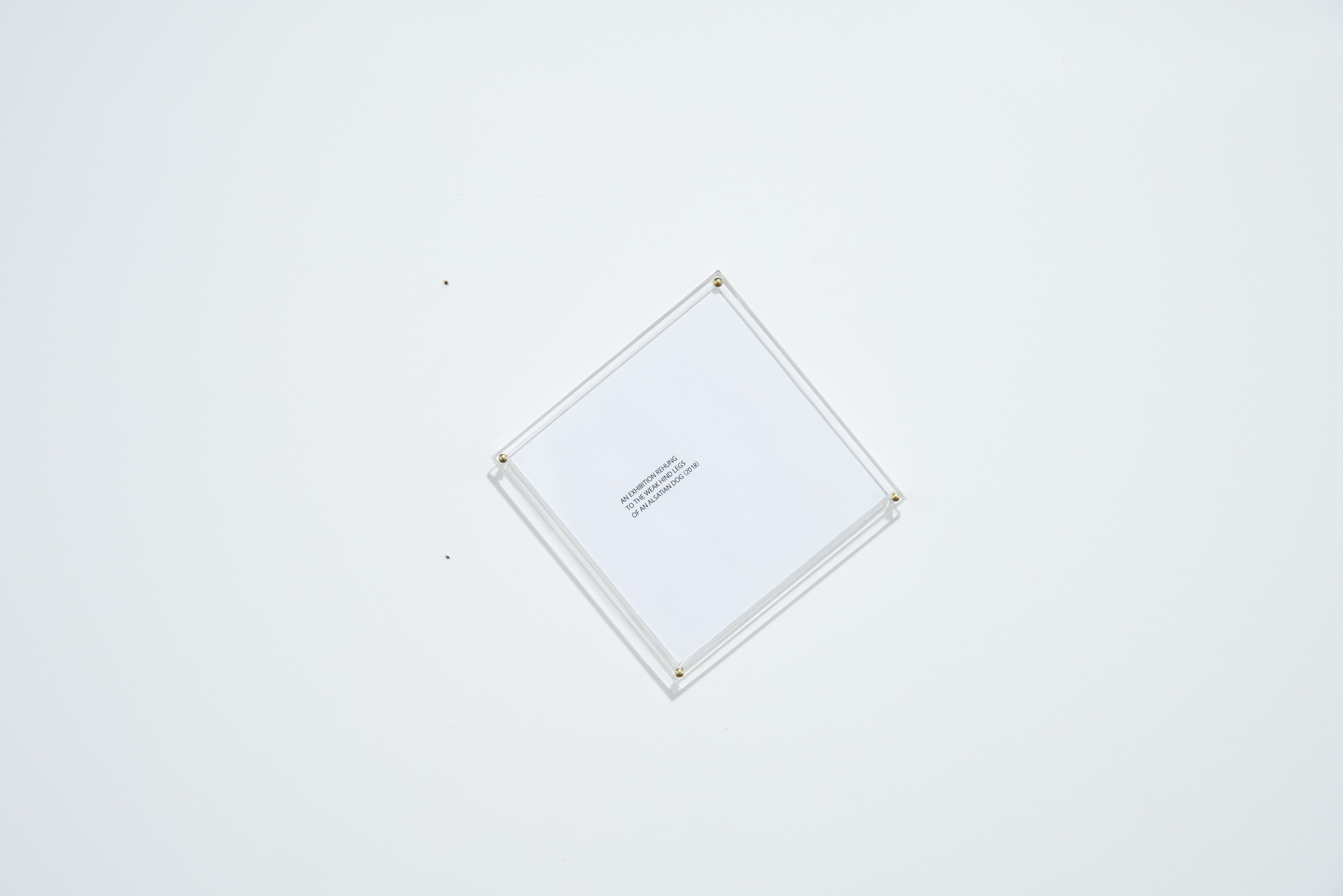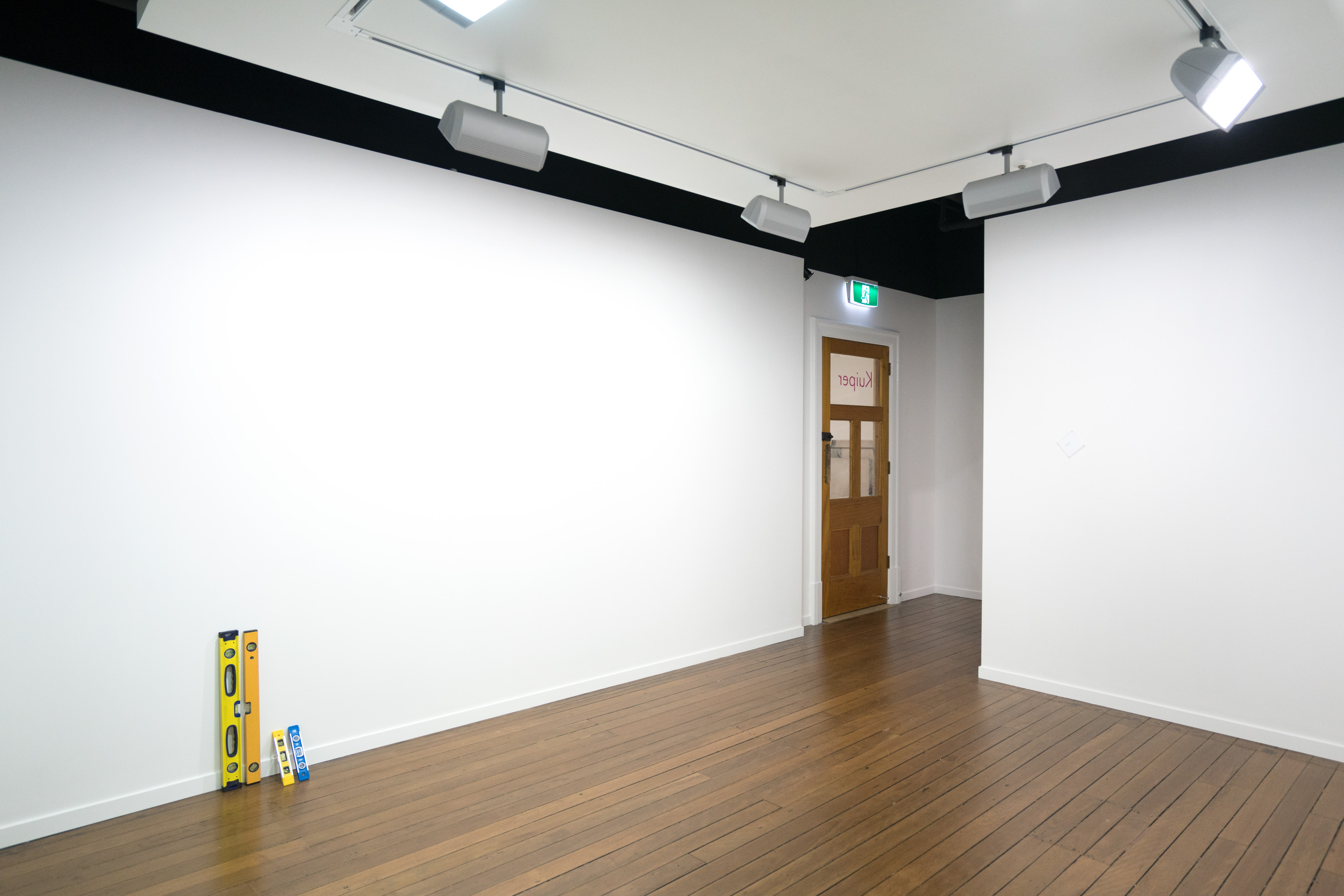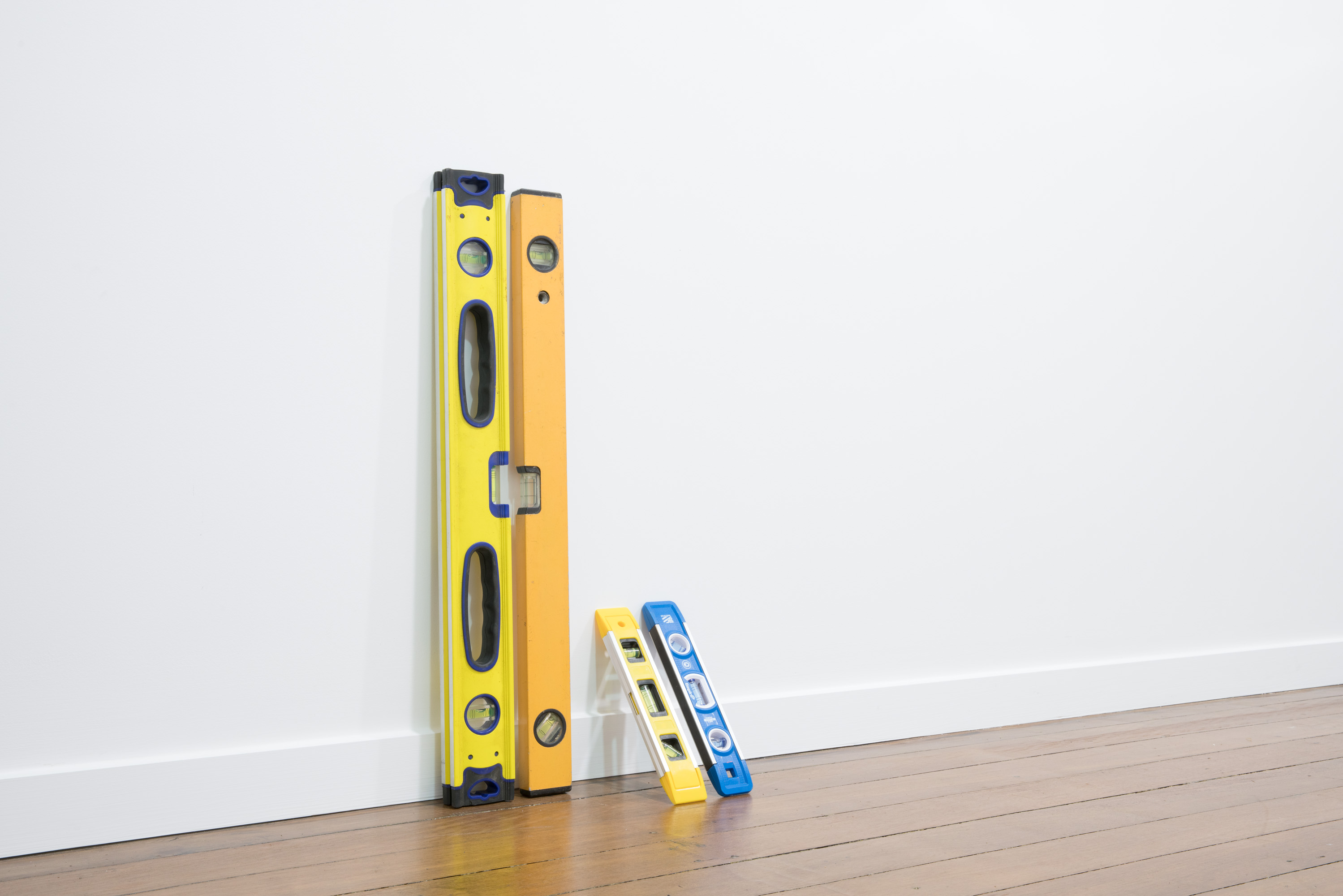 A moment reads as the installation of the exhibition held through time and presented as the work itself. Upon close inspection, the relationship between order and disorder seems to permeate the space. Spirit levels that have been borrowed from galleries lean against the wall, holes pierce the white walls at different points and a framed text sits at the angle that has been reproduced across the space.