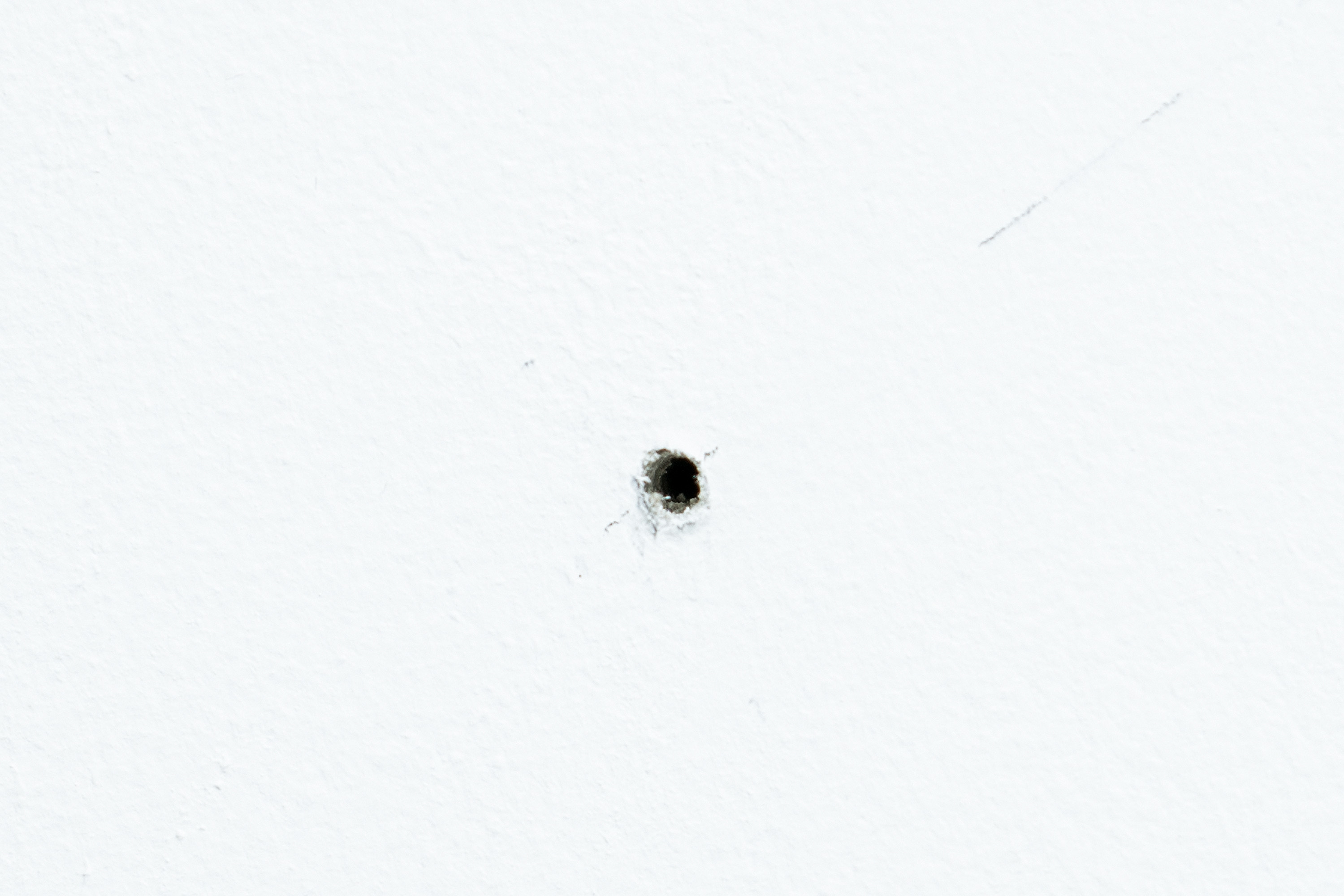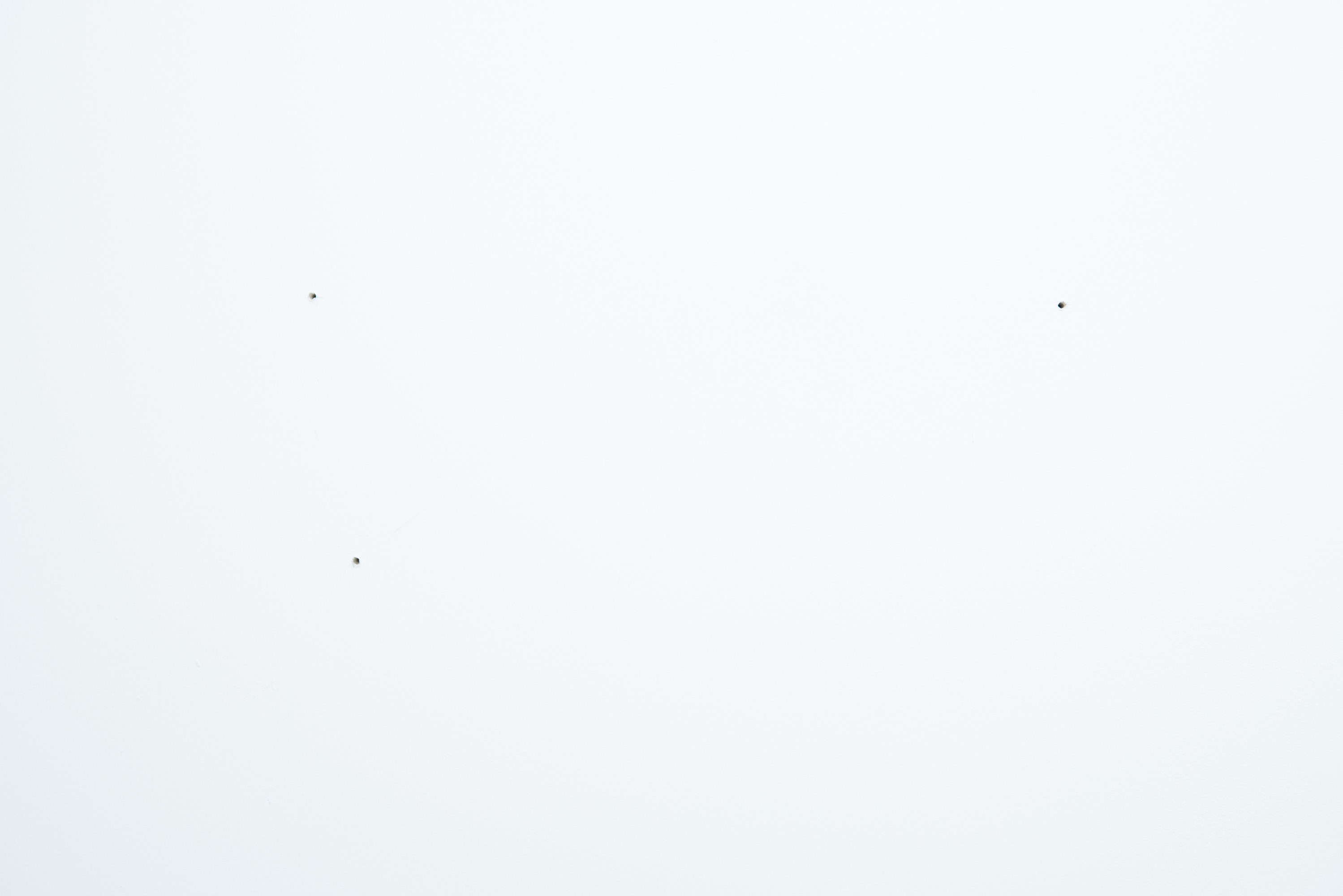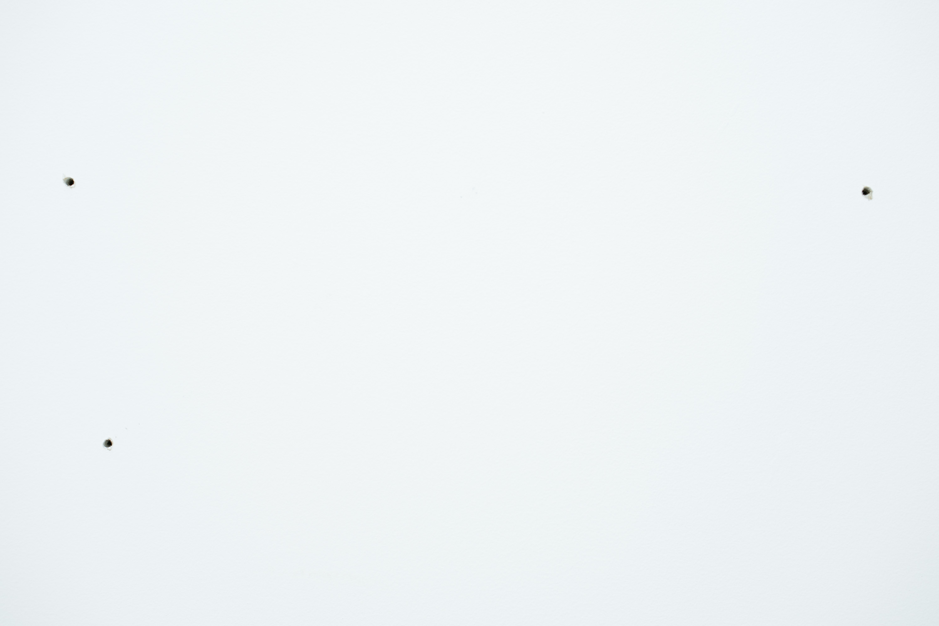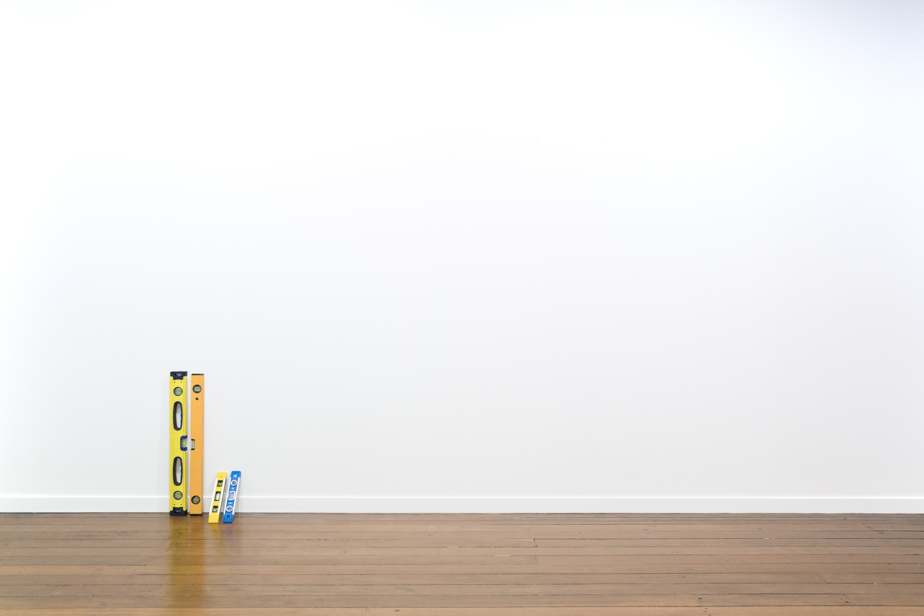 A moment reads as the installation of the exhibition held through time and presented as the work itself. Upon close inspection, the relationship between order and disorder seems to permeate the space. Spirit levels that have been borrowed from galleries lean against the wall, holes pierce the white walls at different points and a framed text sits at the angle that has been reproduced across the space.
