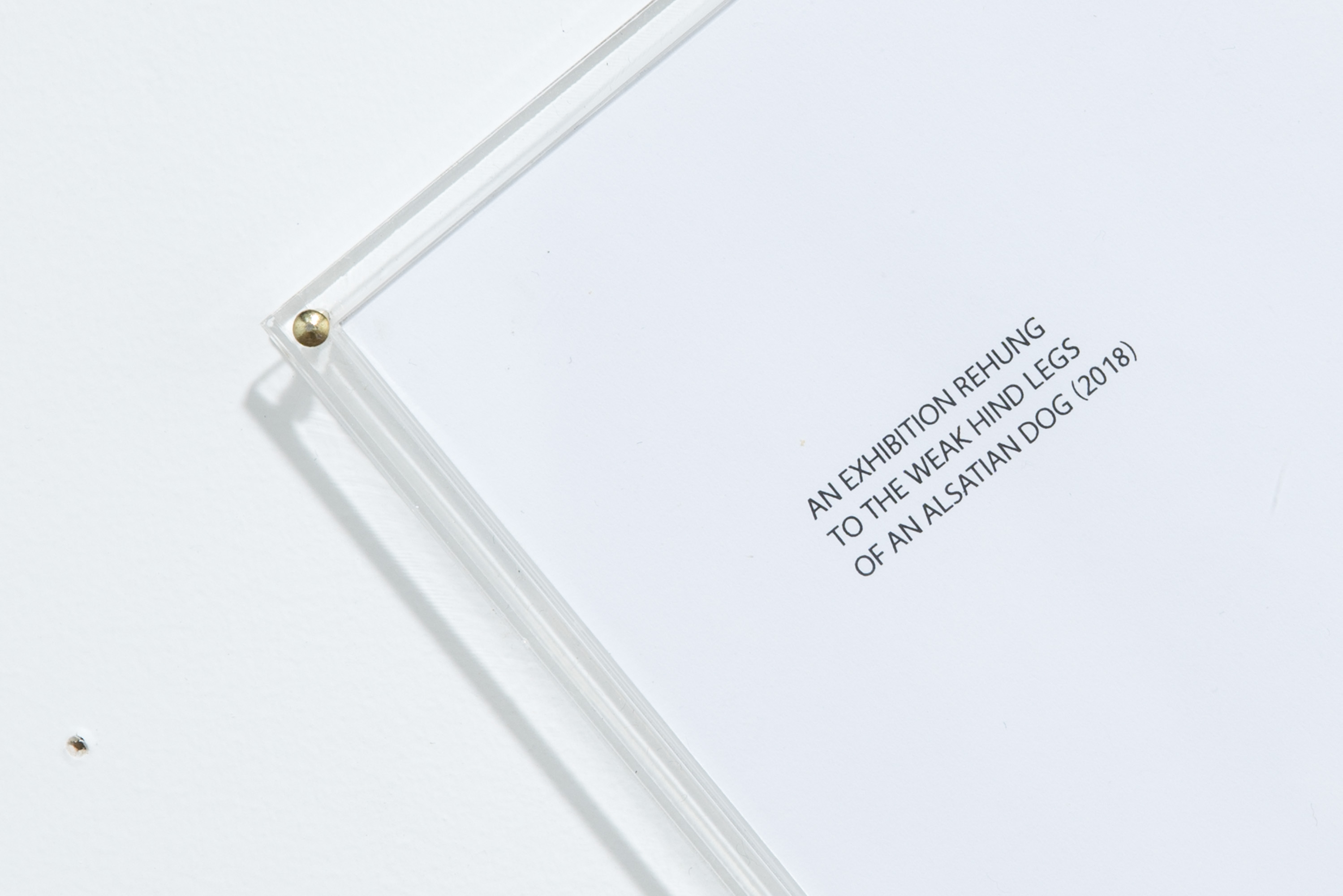 Central Station brings together two instruments of order: the Alsatian dog and the spirit level. The angle of the hind leg that is indicative of Degenerative Myelopathy, a genetic disorder typical of Alsatians, is applied to an exhibition both imagined and real.